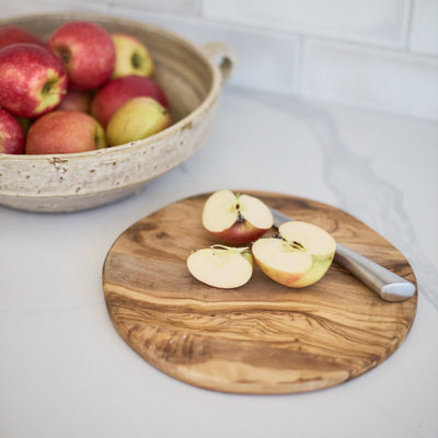 Olive Wood Round Board - Bring rich texture and style to your outdoor dining area with this rustic wooden board, handcrafted in Tunisia from Olive wood. Each board features unique finishes in grain and tone, making them all one of a kind. The perfect base for your cheeses, antipasto or grazing platter, or gifting (bottom left image).