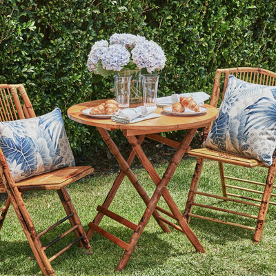 Outdoor Cushion Aloha Navy (50L x 50H cm) - Tropical indoor and outdoor square cushion to create a relaxed, coastal ambience. The soft natural hue of the cushion is complemented by the lush muted blue tones of the elegant tropical leaves print. A premium polyester fabric that is UV and water-resistant, a stylish woven-look with a textured finish. A comfortable complement to the Bamboo Folding Chair Natural or Hampton Outdoor Dining Chair Stone With Ecru (top left and bottom left images).
