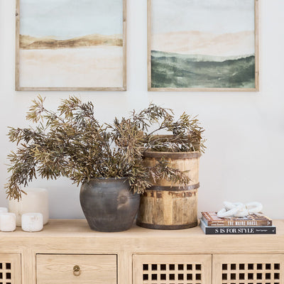 Natural elements are key. Display artificial large fig tree stems in a rustic vase as a statement piece on the dining table, while in the kitchen, place a rustic vase full of fresh flowers gathered from your garden.