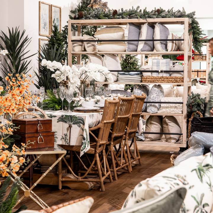 For something more contemporary, our Island-inspired Christmas collection blends tropical prints with metallic finishes. You’ll find the Clara Modular, Le Palm artwork and our new St Kitts furniture range — brass bamboo and glass pieces that bring a hint of glamour.