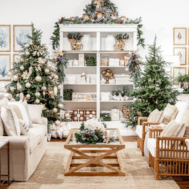 Coastal wreaths and softly decorated Vail Trees complete this relaxed Hamptons-inspired look.