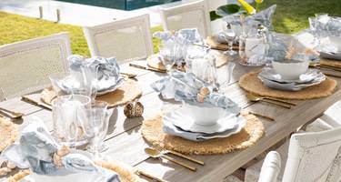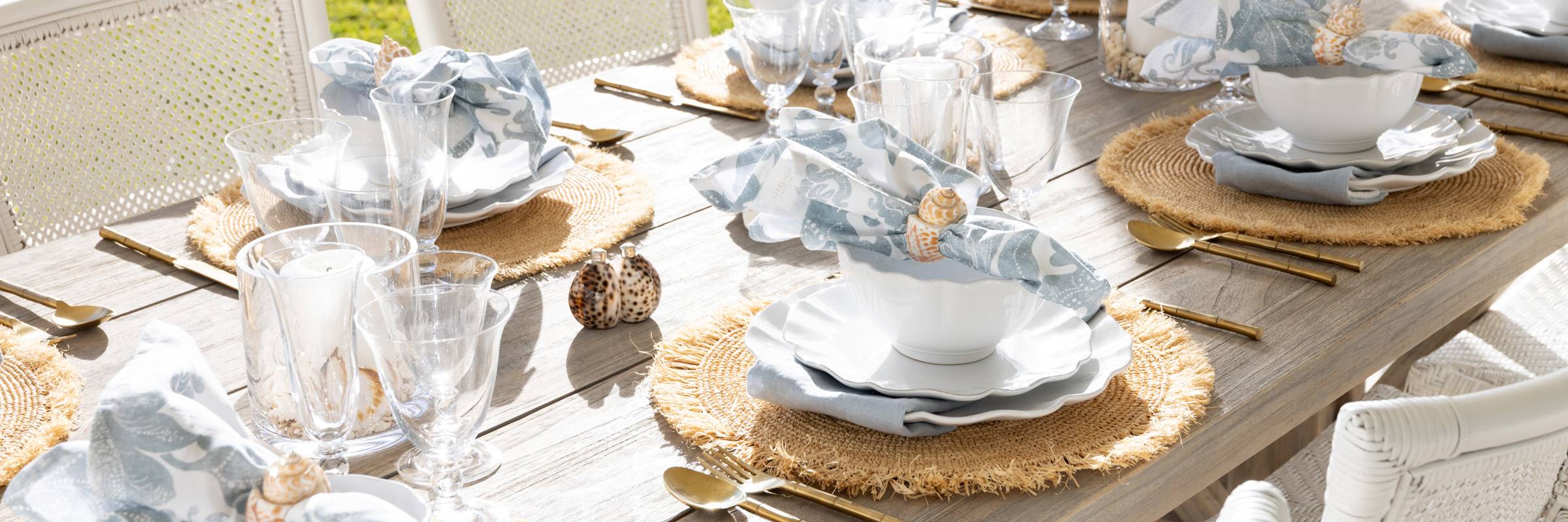 Complete your dining room look with our range of tableware and serving ware. We offer a unique selection of dinnerware, glassware and flatware that can add a touch of sophistication to your dining table. Our table linens and napkins are available in different colours and patterns, perfect for any occasion.