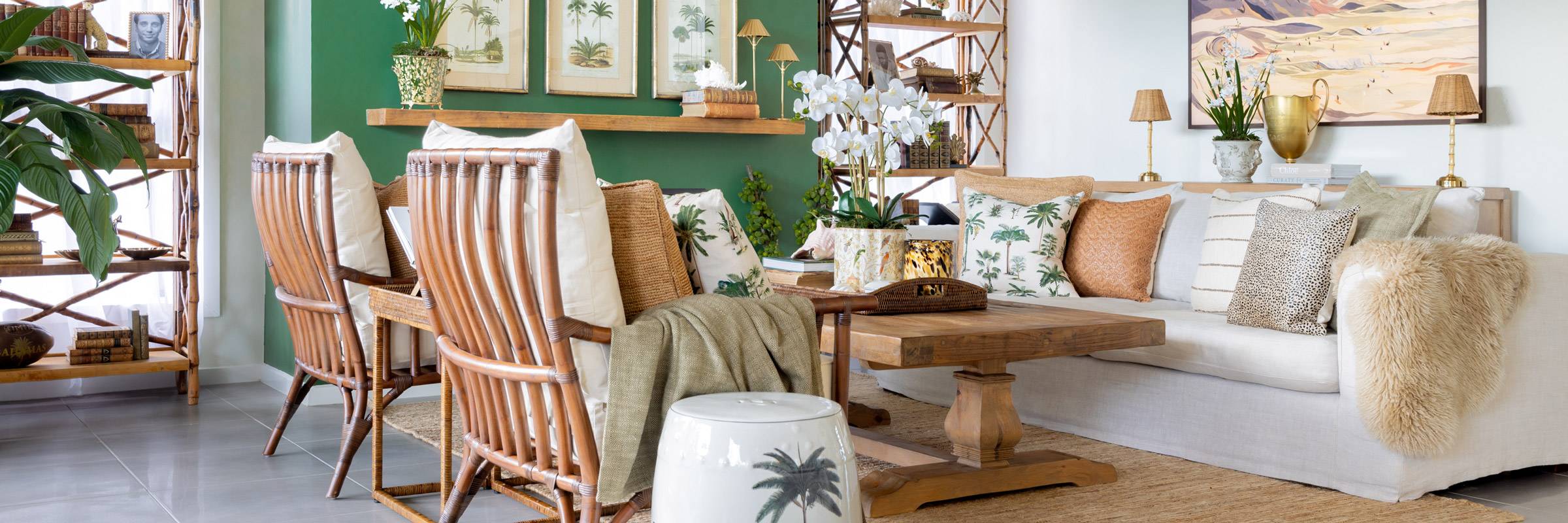A: India Hicks interiors combine British colonial structure with tropical elegance. Use dark wood or elm furniture with crisp white or neutral backdrops, and layer with palm prints, Le Palm cushions, and curated accessories.