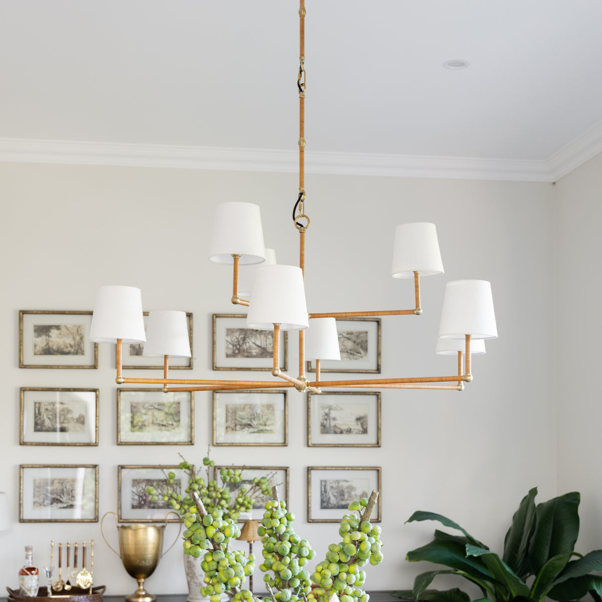 Featuring a rattan-wrapped frame and sleek brass hardware, this chandelier offers a balanced mix of texture and sophistication. Complete with nine crisp white linen shades, it provides soft, ambient lighting, making it an ideal centrepiece for dining rooms, living spaces, or entryways. Perfect for complementing coastal, contemporary, or timeless decor styles.
