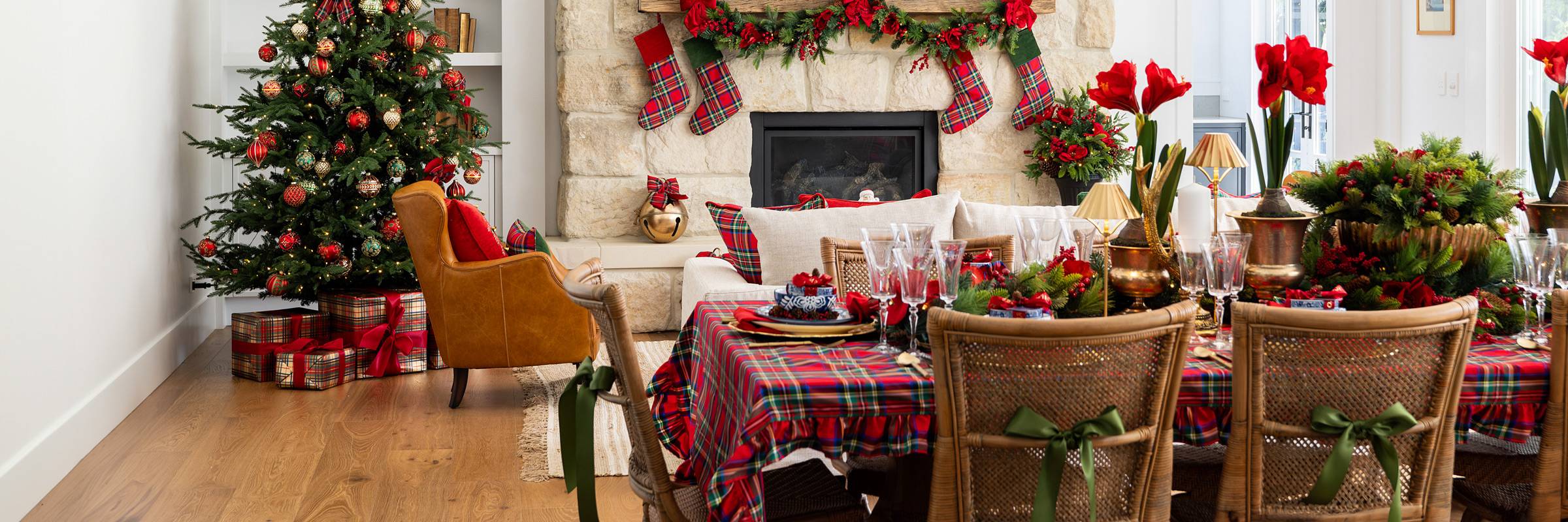 Set the stage for celebration with our Christmas tableware collection; red tartan tablecloths and matching napkins, designed to capture the spirit of classic Christmas entertaining. Layer your table with gold scalloped chargers, bamboo cutlery and glassware for a refined finish, while amaryllis flowers add a touch of natural elegance. This timeless combination of texture and colour ensures your festive dining is both joyful and beautifully styled.
