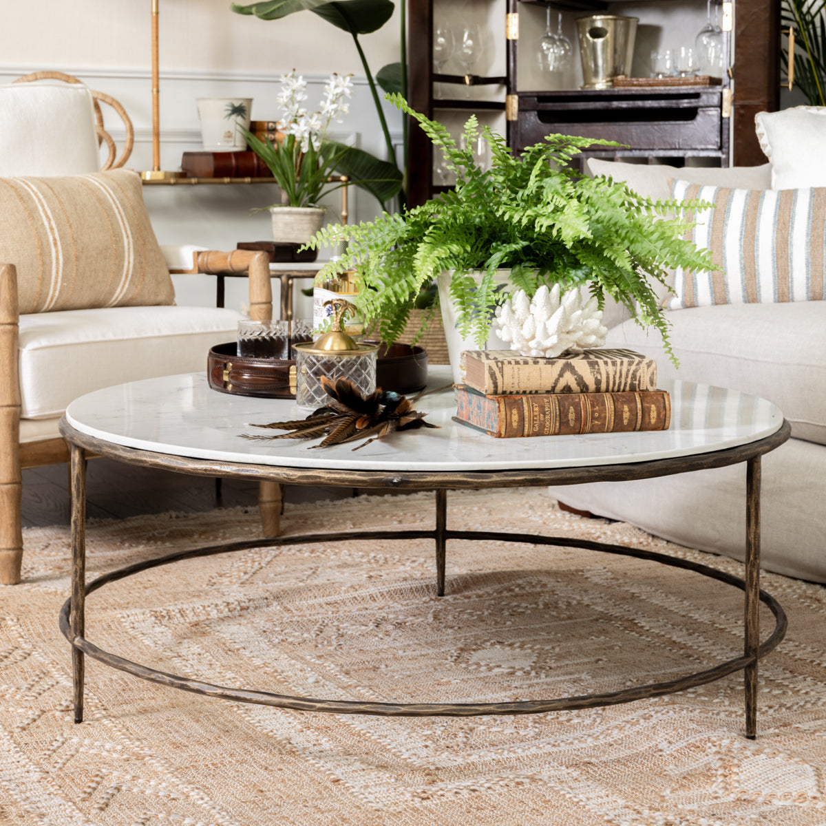 The expansive white marble top, characterised by soft grey veining, offers a clean and luxurious surface that becomes a natural focal point in any room. Its generous, round shape invites effortless styling, accommodating books, trays, florals, and everyday living with ease.
