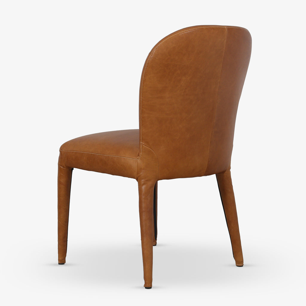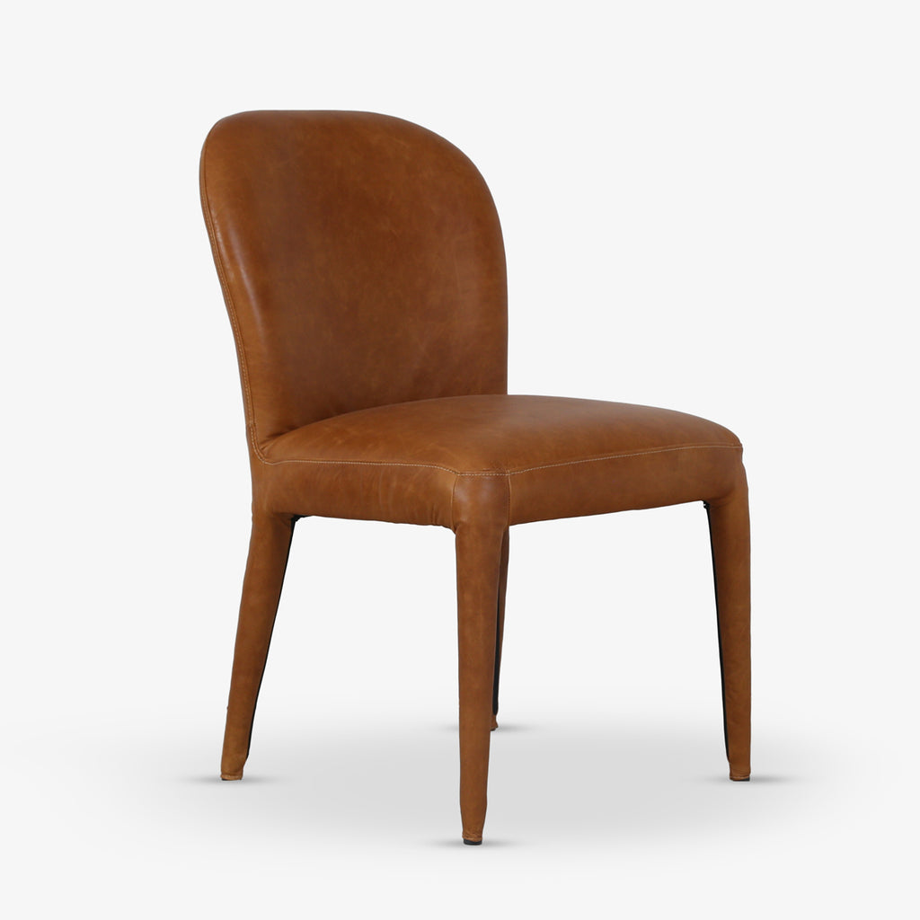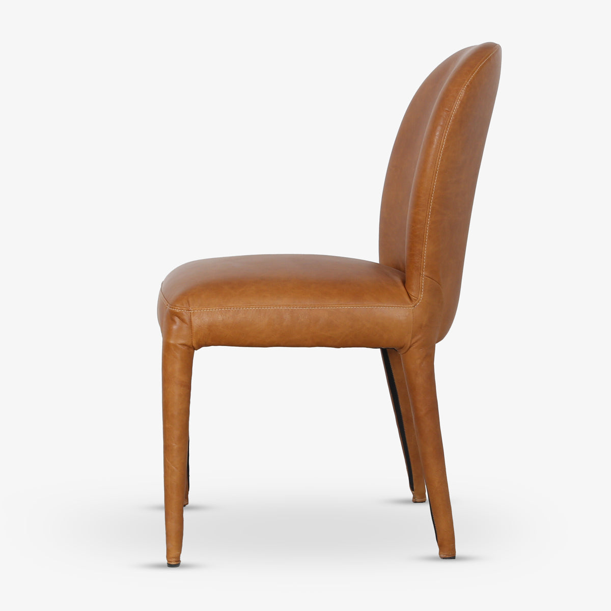 Enhance your dining setting with the Aura Leather Dining Chair in Tan, fully upholstered in genuine premium leather for a seamless and sculptural look.