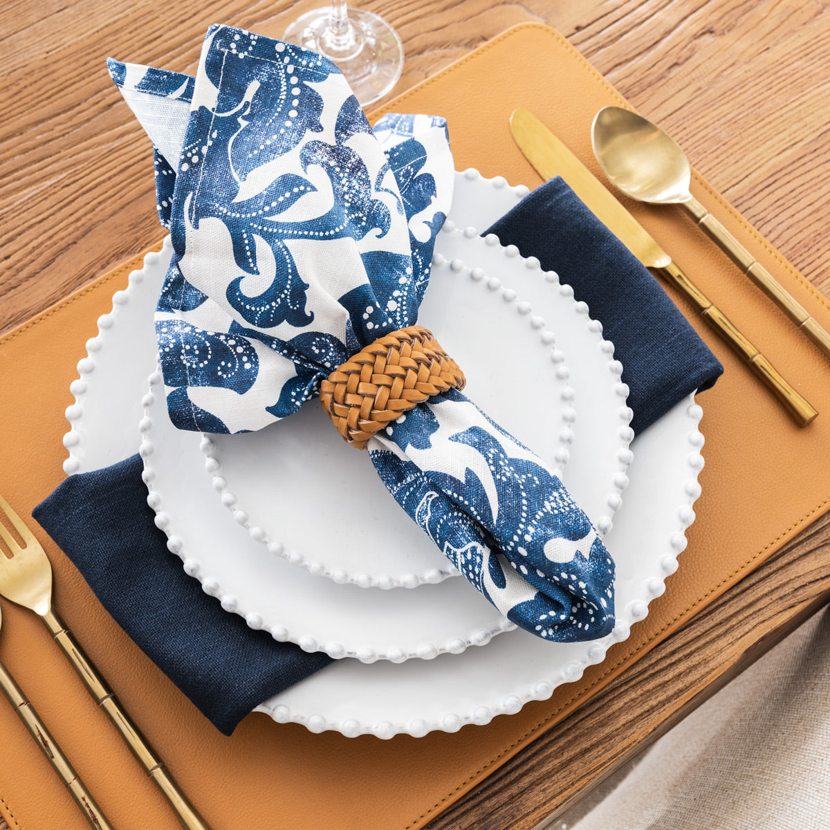 Enhance your table setting with the Batik Napkins Set of Four in Navy, crafted from 100% cotton for a soft, durable finish.