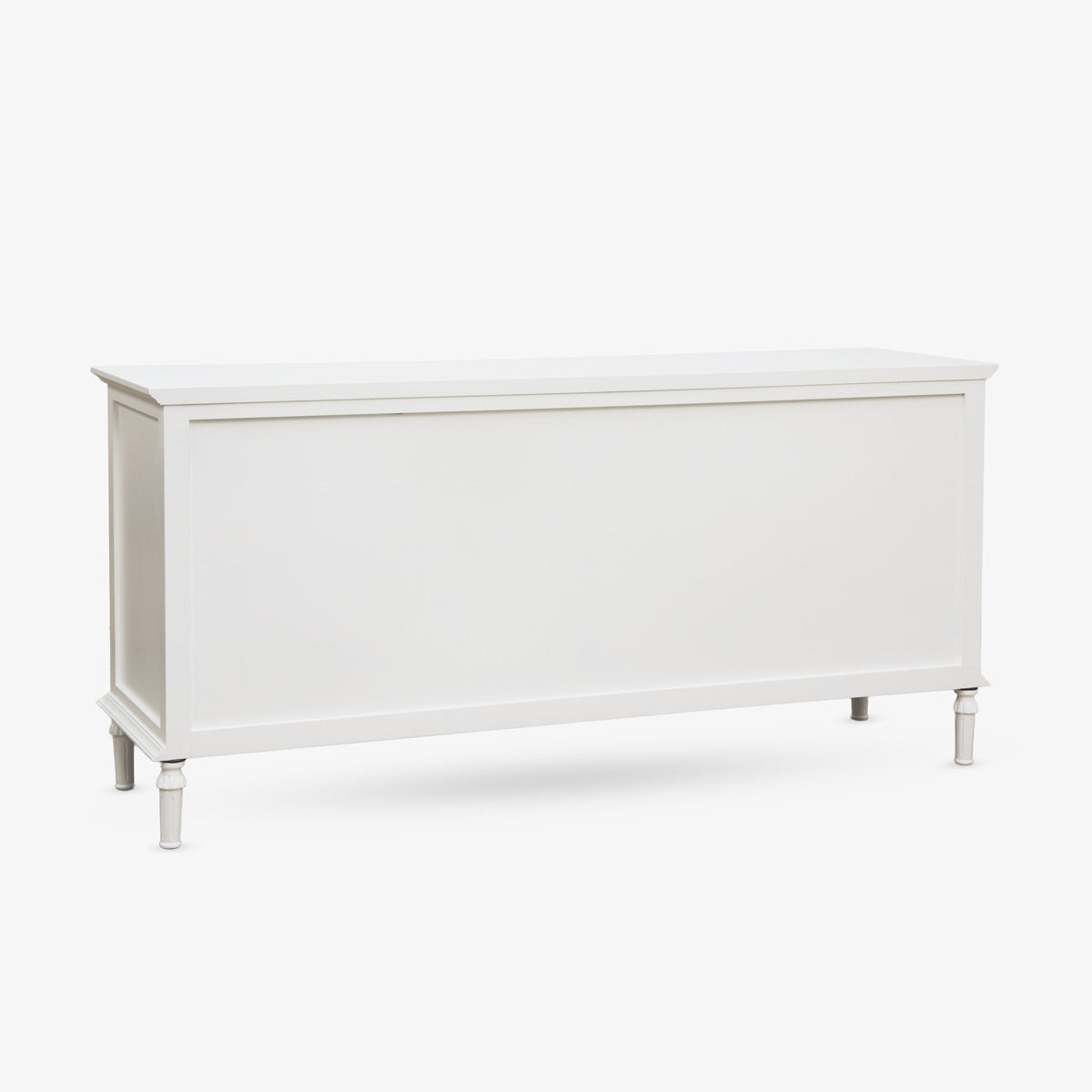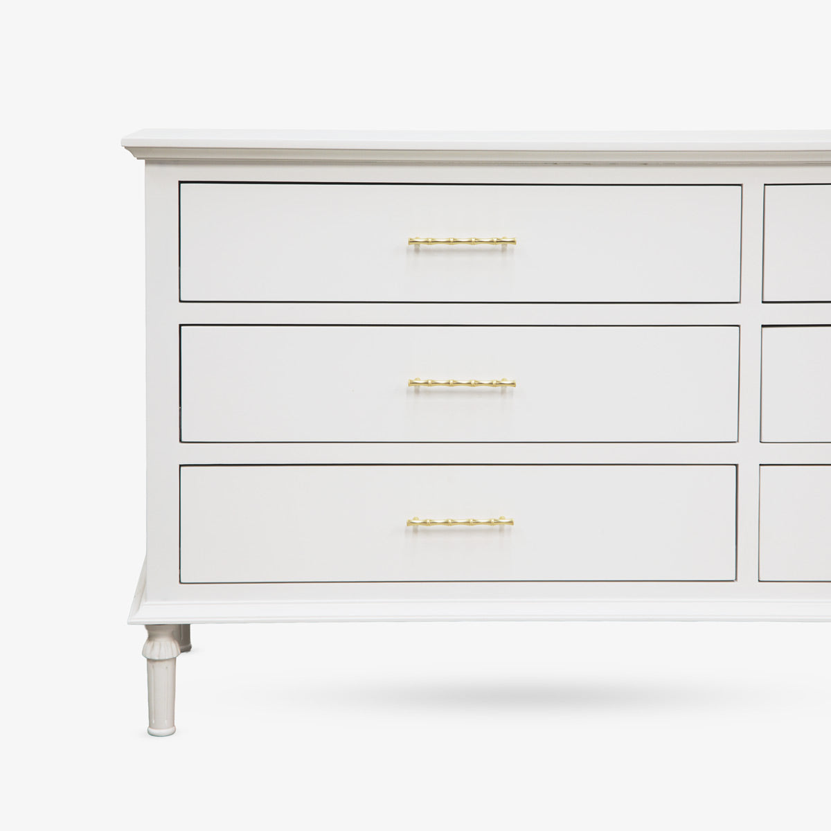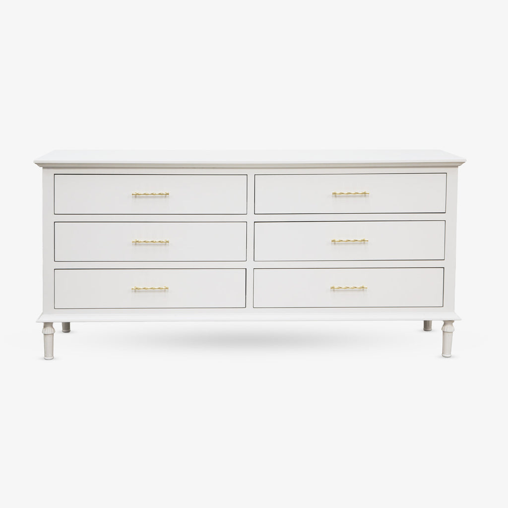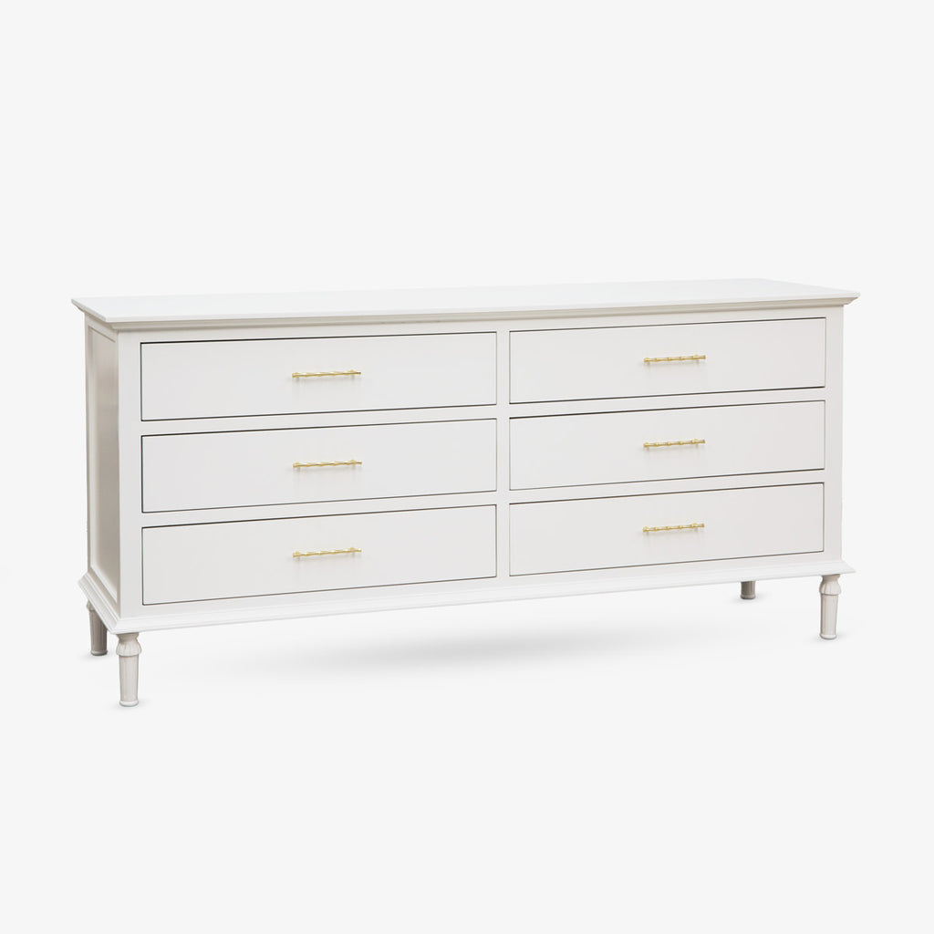 This six-drawer unit is finished in a fresh white tone and styled with refined proportions and a clean silhouette for timeless appeal. Its sturdy construction makes it suitable for bedrooms or living spaces, offering generous storage without compromising on design. Gold bamboo-style handles bring a subtle decorative accent, pairing effortlessly with both traditional and coastal-inspired interiors.