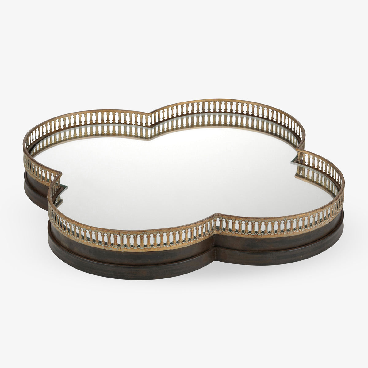 Elevate your decor with the Clover Mirror Tray, an elegant metal mirror tray handmade from antique gold-toned metal.