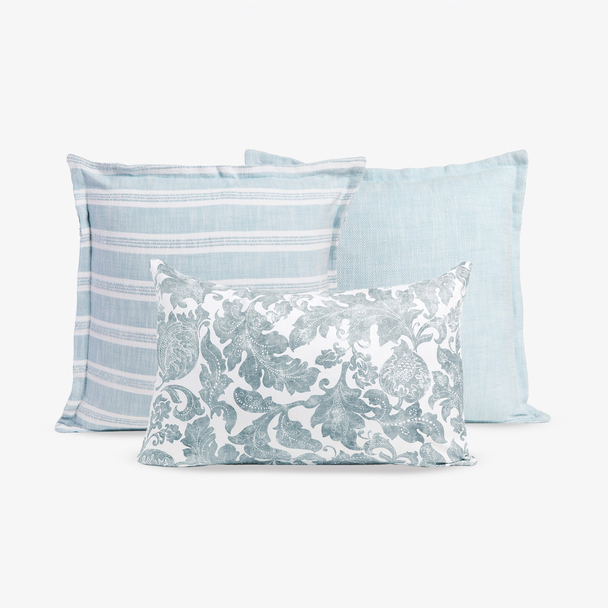This bundle includes the Batik Cushion Cover (Marine Rectangular), featuring a serene blue and white floral batik print that adds refined pattern and balance to any cushion arrangement. Paired with the Rhodes Stripe Cushion Cover in light blue and the Edessa Diamond Cushion Cover in matching tones, this bundle creates a harmonious mix of texture, pattern, and calming colour.