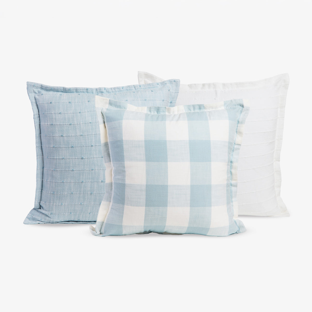The bundle includes the Aurora Check Cushion Cover in a gentle blue and white check, adding a fresh, breezy feel to your space. The Xanthi Cushion Cover in light blue brings subtle charm with its delicate woven dot and line texture, while the white version of the Xanthi Cushion Cover offers a refined look with its breathable cotton weave and soft detailing.