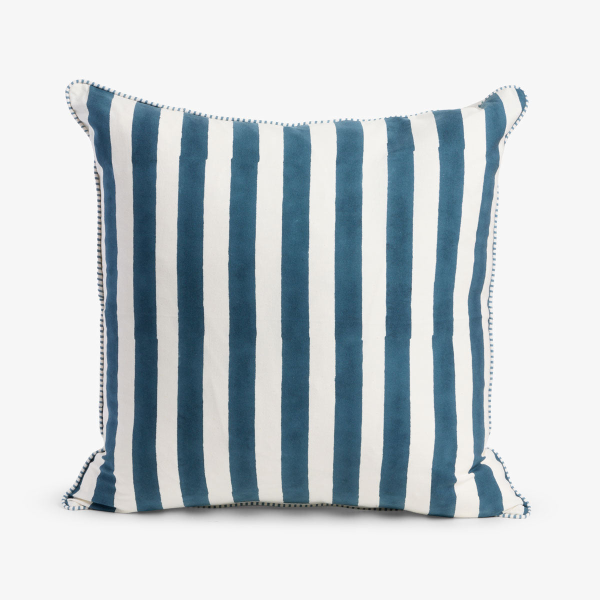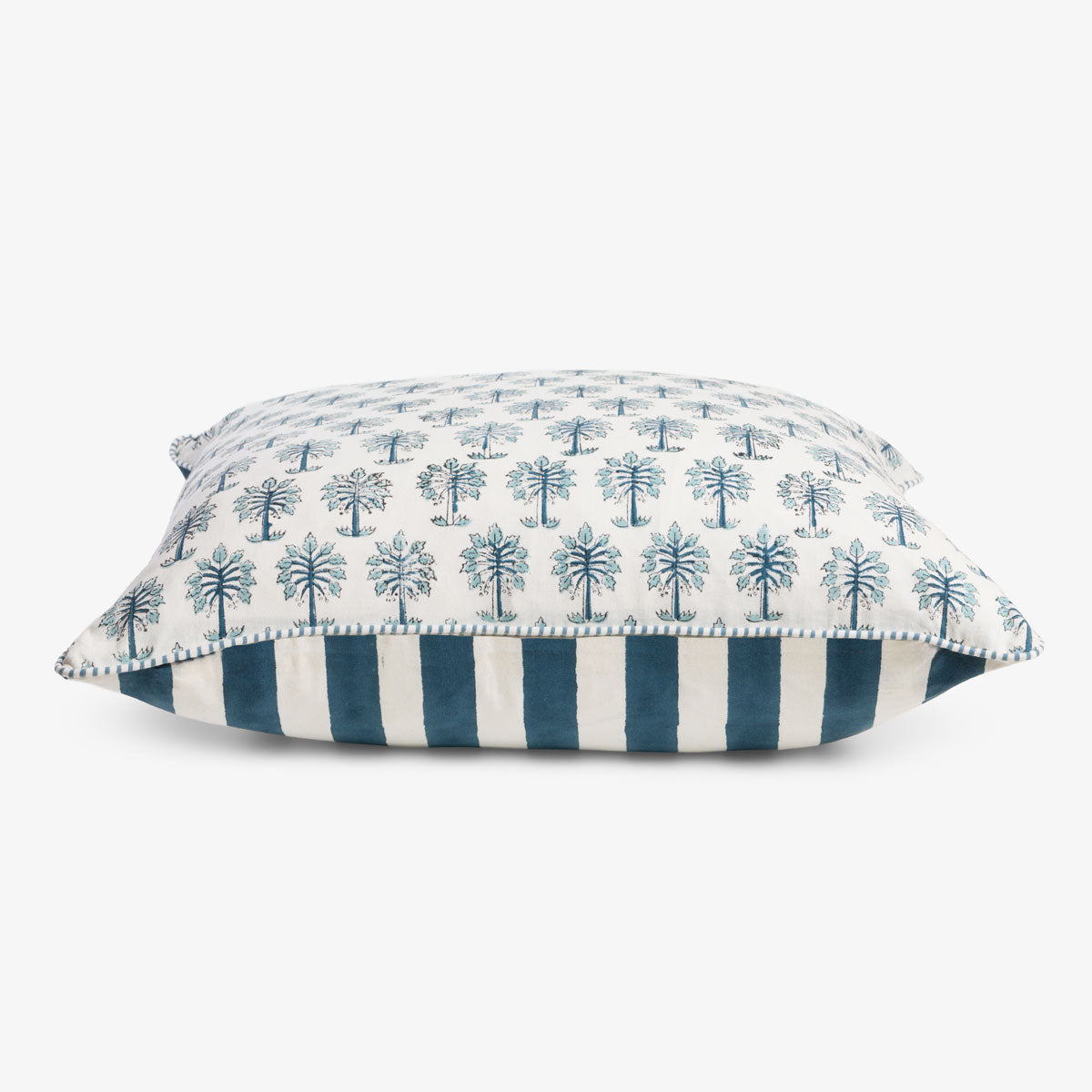Featuring a palm print on one side and bold contrasting stripes on the reverse, this cotton cushion cover offers two looks in one for effortless seasonal updates.