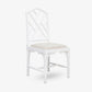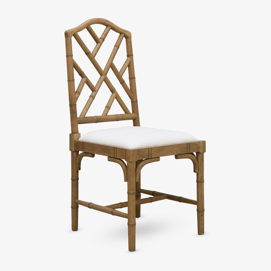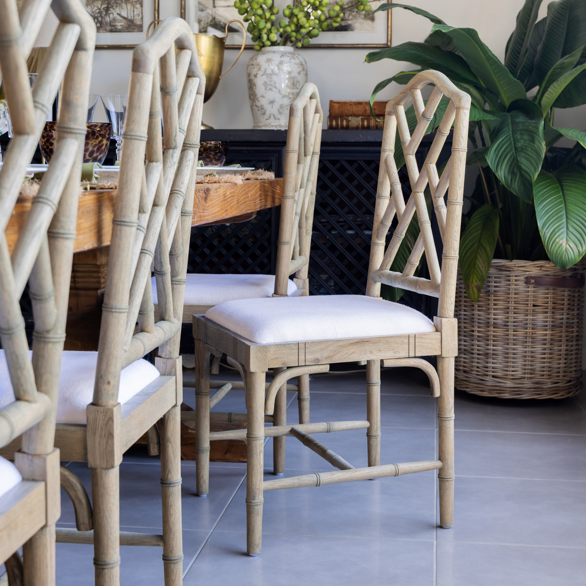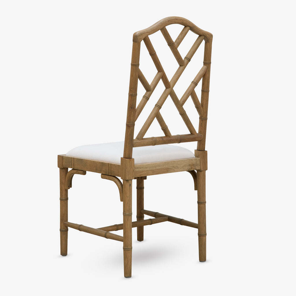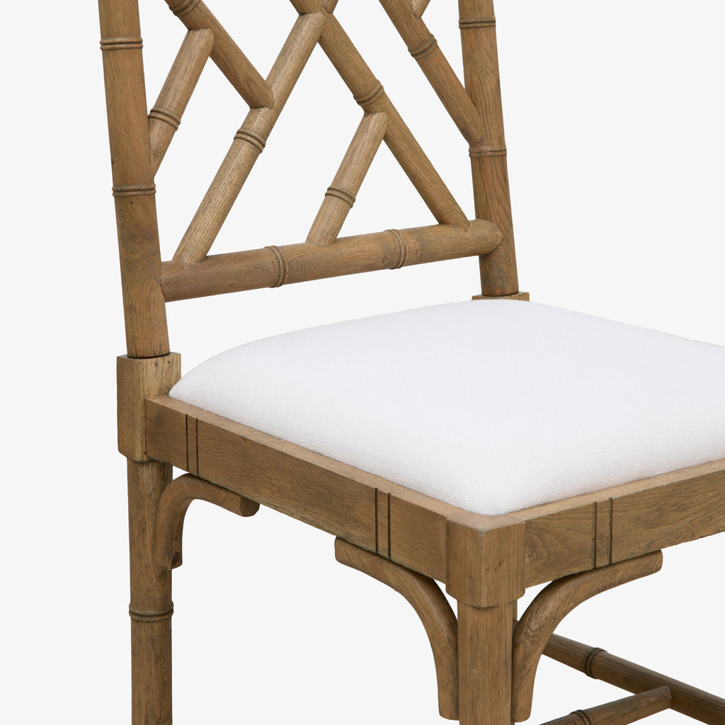 Crafted from carved timber with a white linen-upholstered seat, this piece combines decorative flair with everyday comfort. The lattice-style back and bamboo-inspired frame nod to traditional chinoiserie design, adding visual texture without overwhelming a space. Ideal for dining rooms, sunrooms or accent seating.