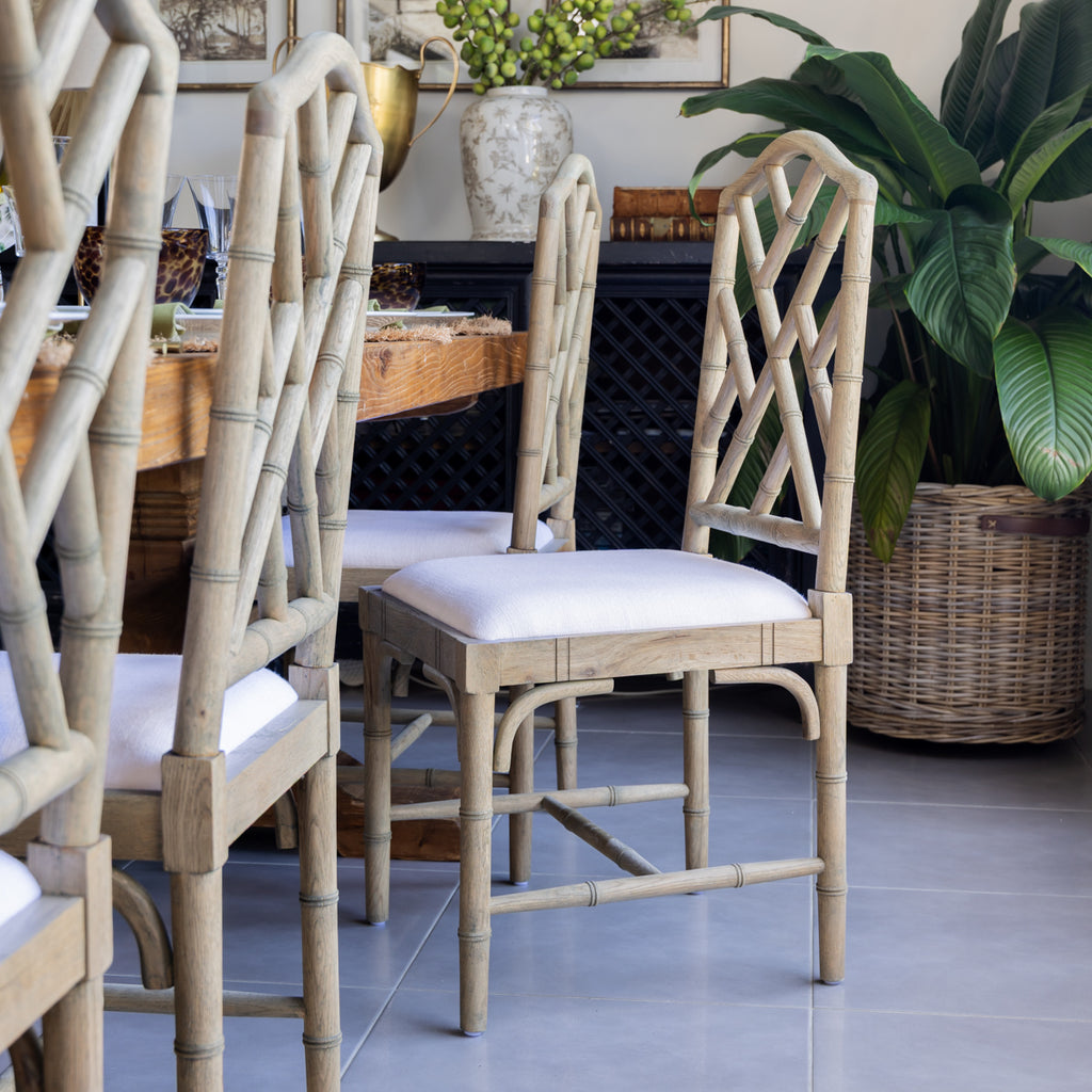 Bring character and charm to your dining setting with the Indira Chinoiserie Dining Chair in oak.