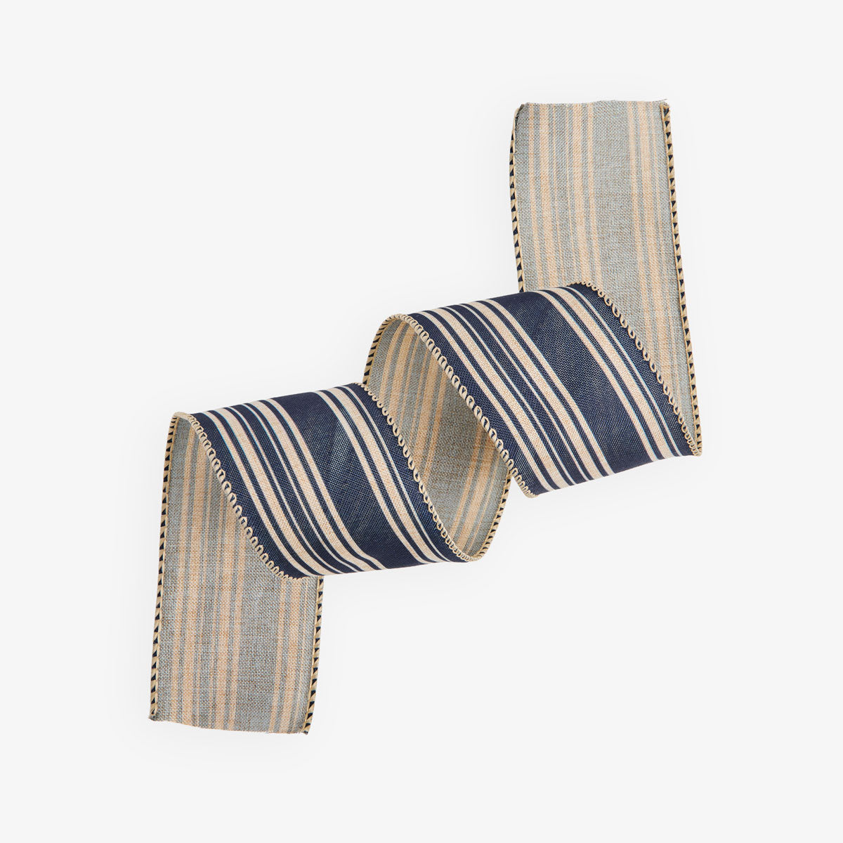 Featuring classic navy and natural stripes with a subtle gold edge, this versatile wired ribbon holds its shape beautifully, making it ideal for creating elegant bows, wrapping gifts, or adding decorative touches to wreaths and garlands. With 10 metres per roll, it’s perfect for enhancing your Christmas tree or year-round coastal-inspired decor.