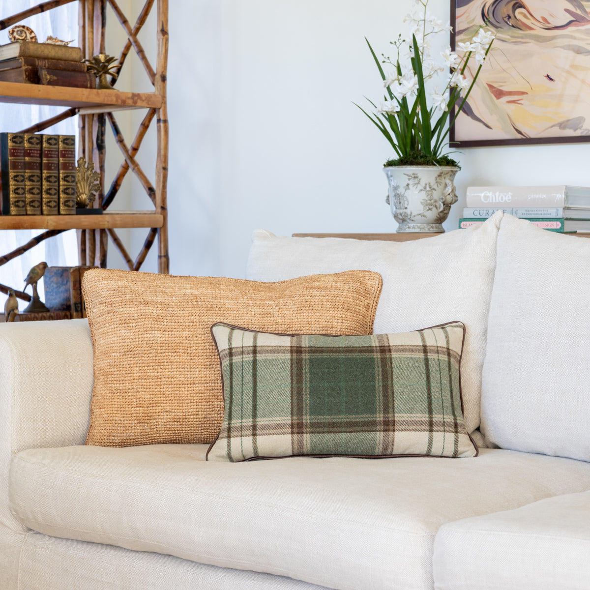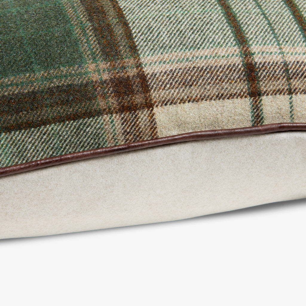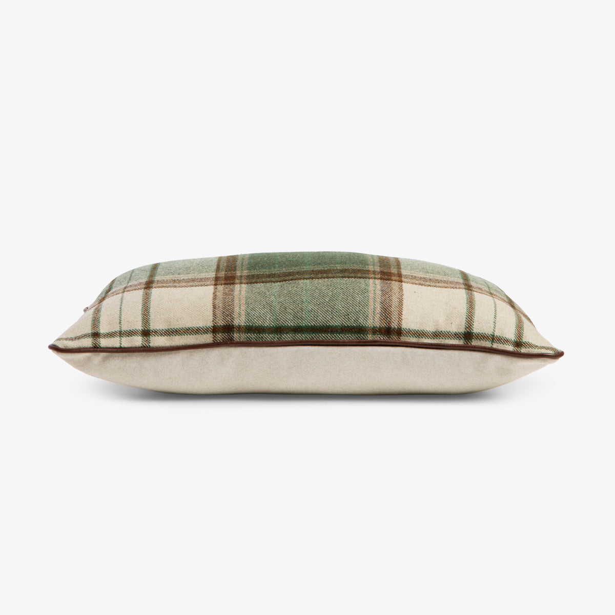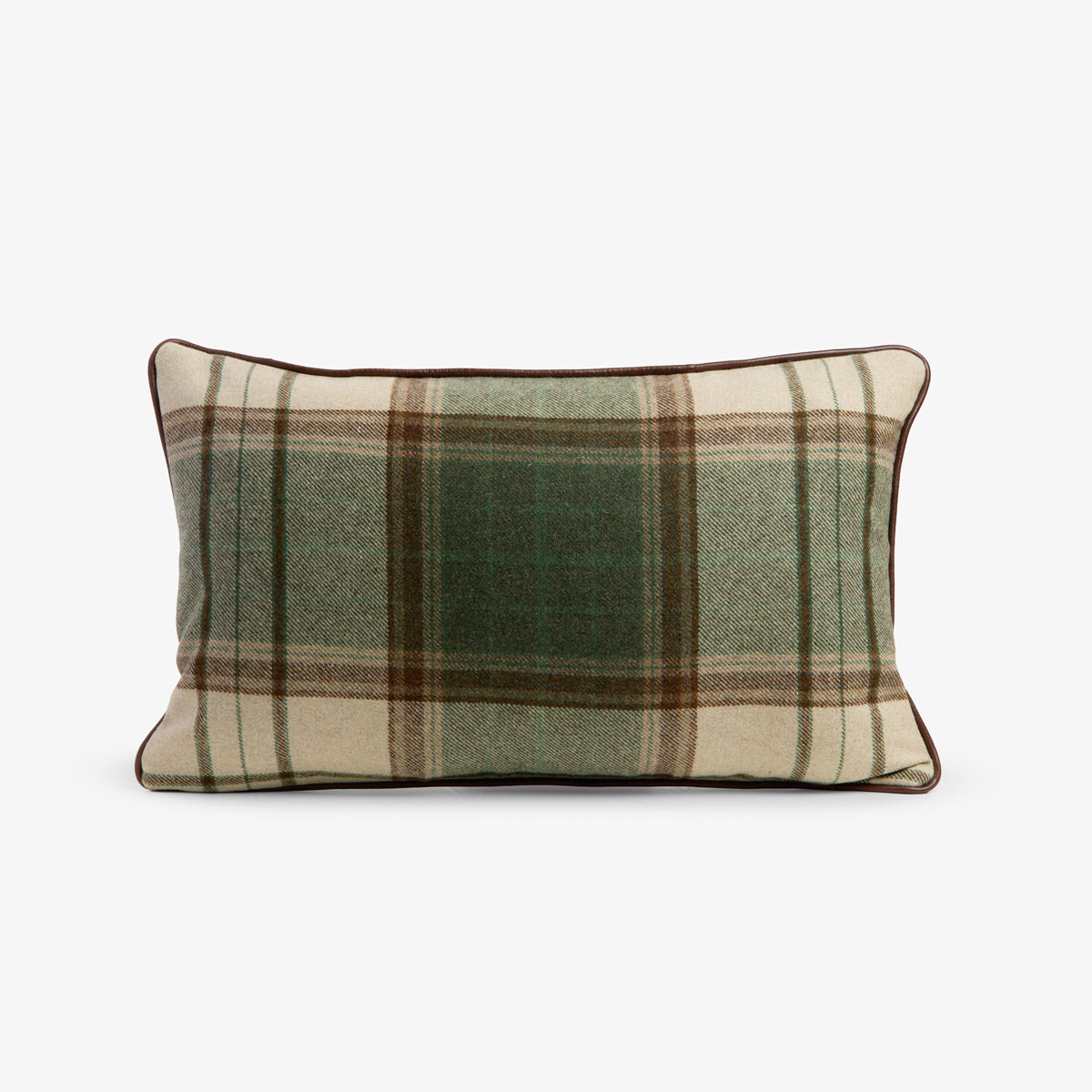 Made with a wool-blend front in a traditional green tartan, this piece is finished with leather piping for a refined touch. The reverse side features a soft bone-coloured felt, creating a balanced mix of texture and comfort. Ideal for layering, this rectangular cushion is a versatile accent for sofas, armchairs or beds.