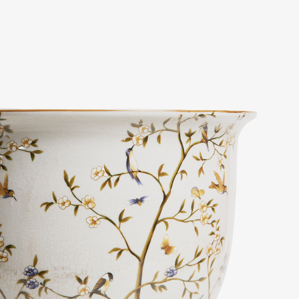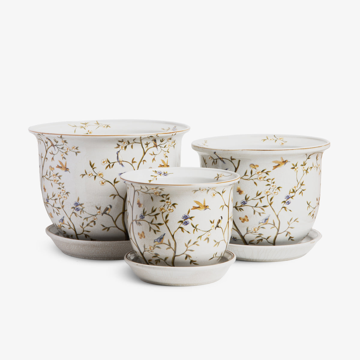 Crafted from fine porcelain, each planter features a delicate hand-painted design of hummingbirds and blossoming branches in soft tones of gold, blue, and cream. The subtle crackle finish and coordinating saucer add to their timeless, artisanal appeal.