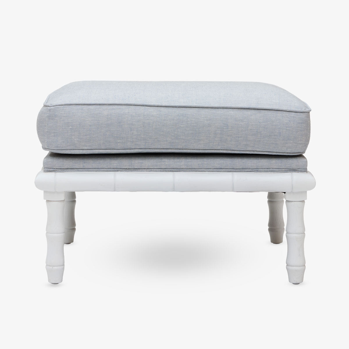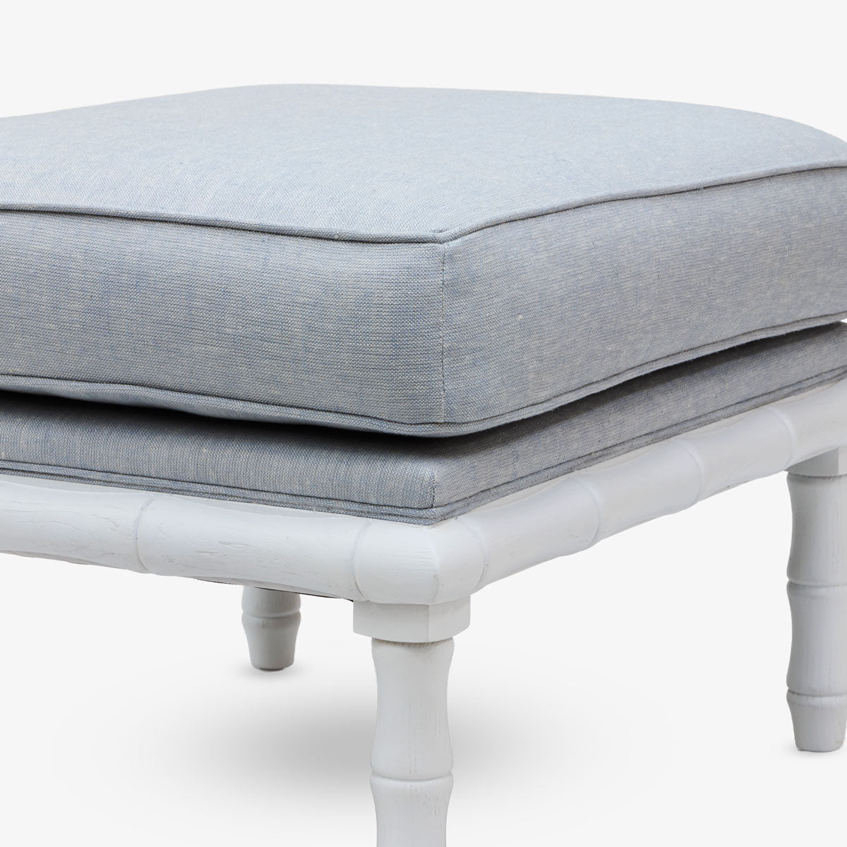 Bring refined charm to your living space with the Indira Bamboo Ottoman in a white frame with duck egg upholstery.