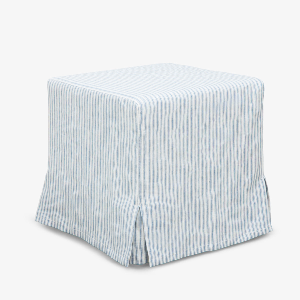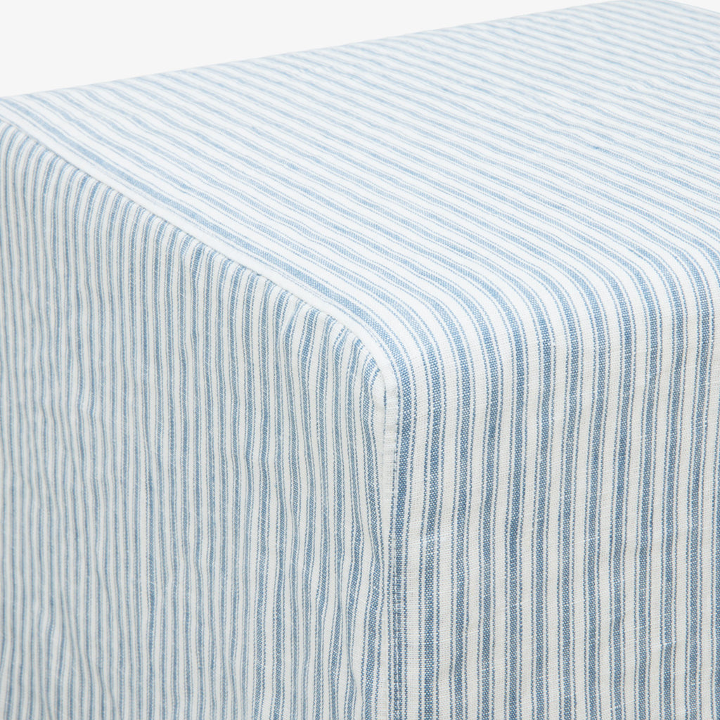 This charming cube is softly padded and upholstered in 100% linen, showcasing a timeless stripe pattern in soft sky and white tones. Its structured silhouette and subtle pleated corners bring elegance and comfort to bedrooms, reading nooks, or lounge areas. Whether styled solo or paired with a matching armchair, it makes a relaxed yet refined statement.