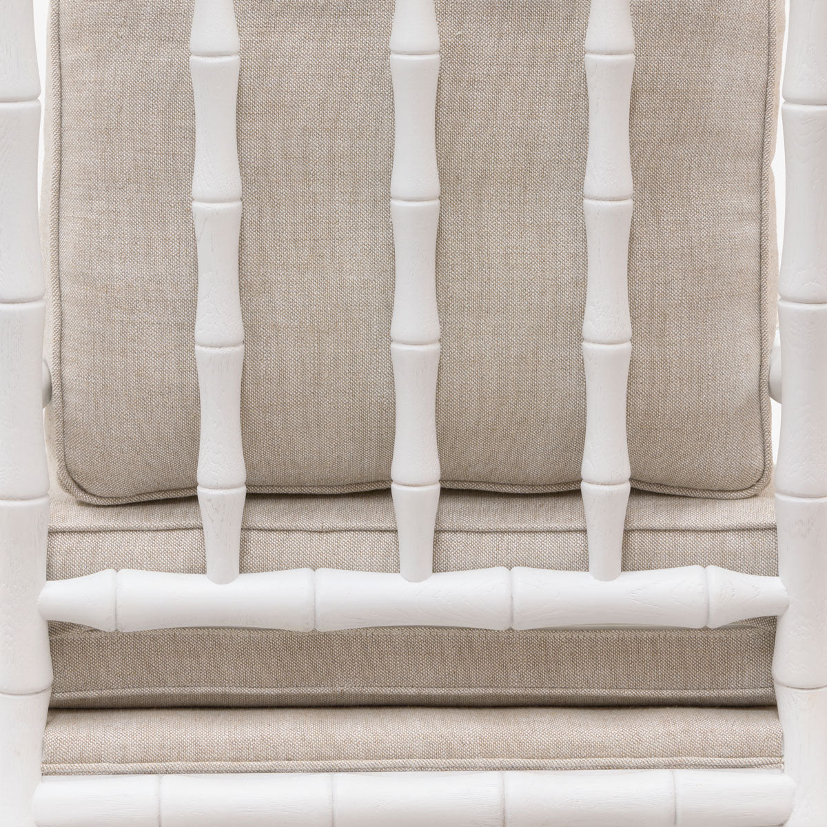 Crafted from carved oak and finished in white with a beautiful grain pattern, the frame beautifully mimics the look of natural bamboo. The plush cushions are upholstered in a soft linen-cotton blend in a warm natural hue, offering a refined yet relaxed aesthetic. From coastal retreats to contemporary homes, this armchair pairs timeless design with everyday comfort.