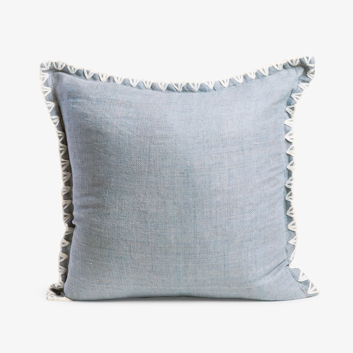 Crafted from 100% linen, this cushion features a gentle light blue tone complemented by a white reverse for a fresh, balanced look. The cream embroidered edge adds subtle texture and detail, enhancing its refined yet relaxed style.