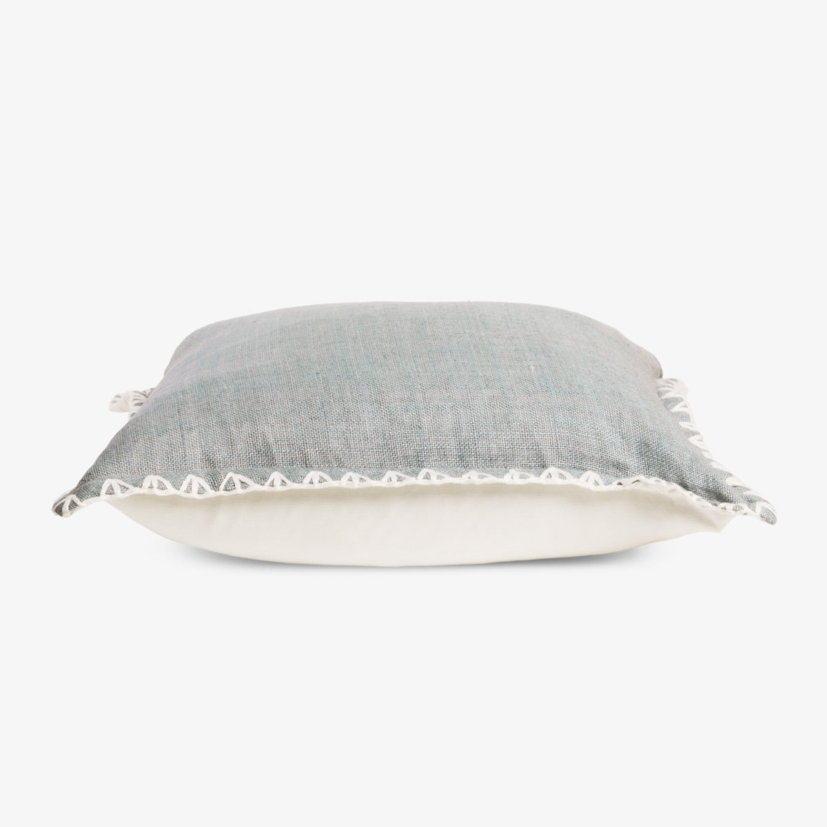 Crafted from 100% linen, this cushion features a gentle light blue tone complemented by a white reverse for a fresh, balanced look. The cream embroidered edge adds subtle texture and detail, enhancing its refined yet relaxed style.