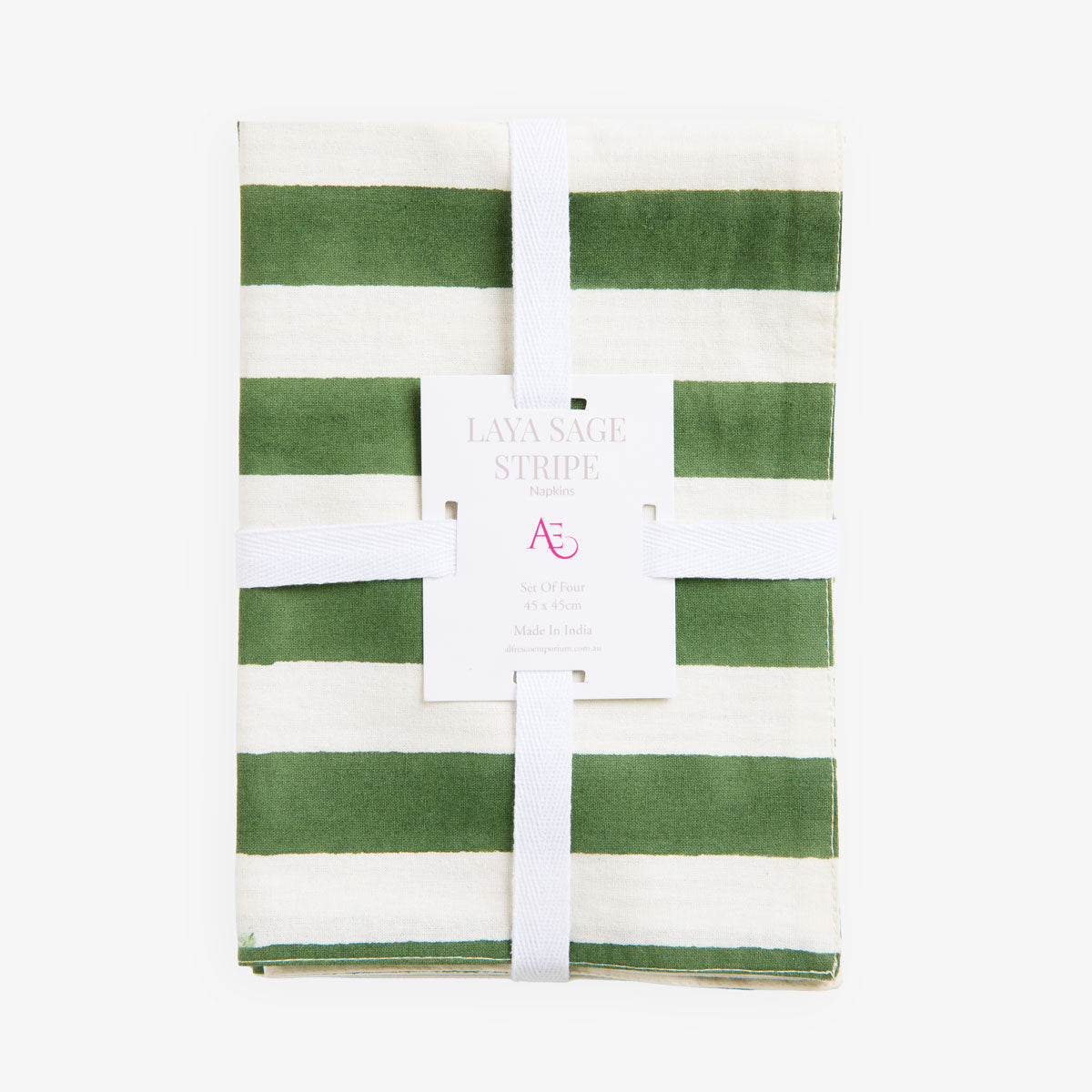 Refresh your table setting with the set of four, Laya green and white wide stripe napkins, a bold and timeless addition to casual or festive dining.