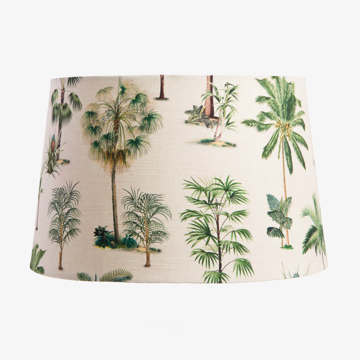 Crafted from 100% cotton, this beautifully tailored shade features a refined palm tree print in layered greens set against a soft natural base, evoking a sense of warmth and coastal sophistication. The gently tapered silhouette enhances both classic and contemporary lamp bases with balanced proportion and timeless appeal.