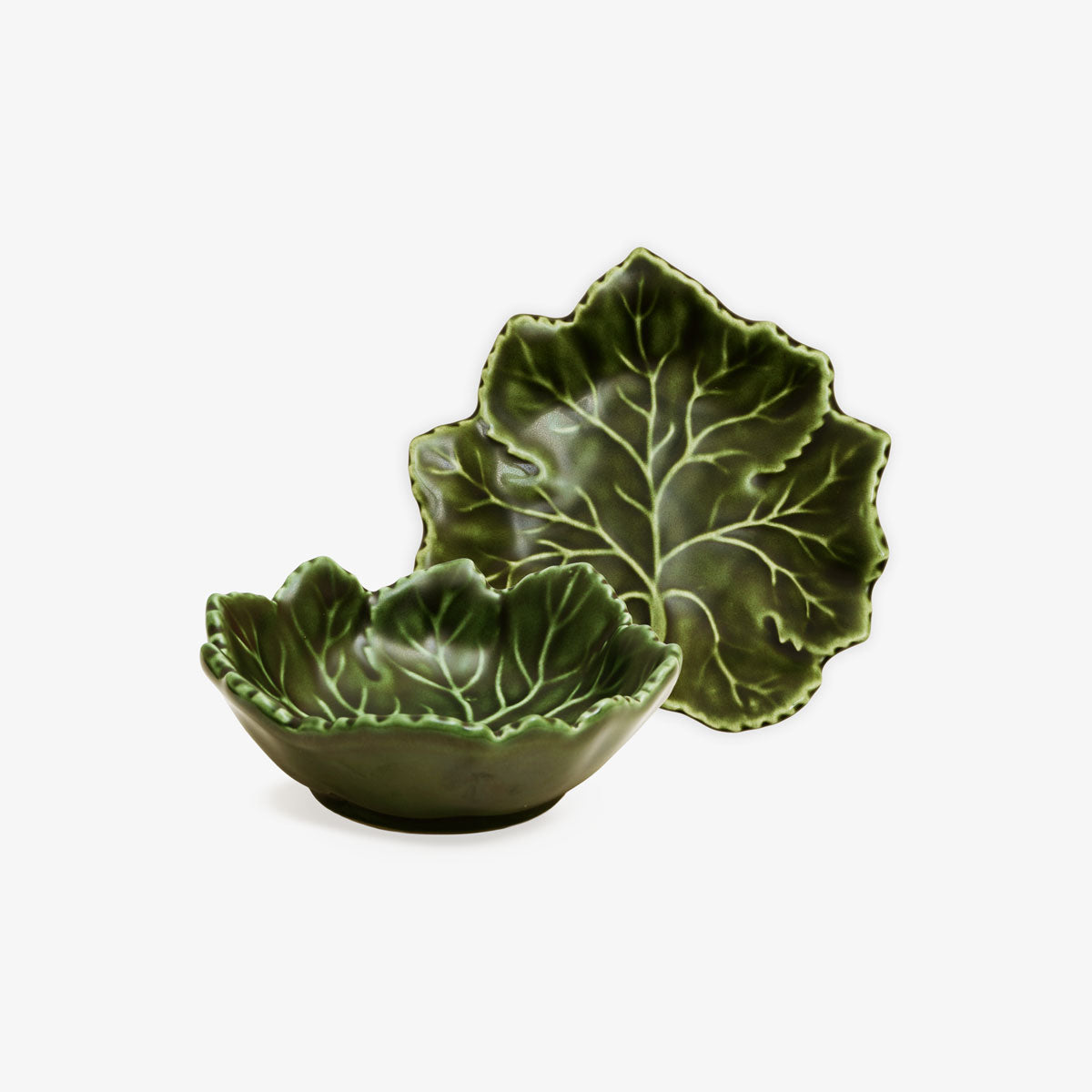 Sculpted with delicate leaf detailing and finished in a rich green glaze, each piece captures the look of gathered foliage, adding depth and character to everyday dining and entertaining.