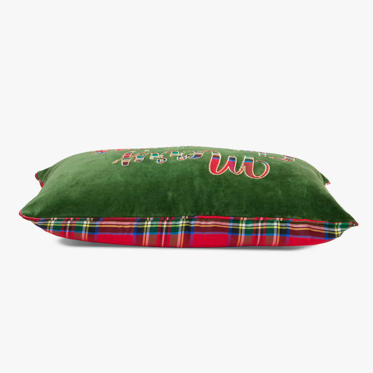 Made from plush cotton velvet, the front features a vibrant "Merry Christmas" embroidered in multicoloured tartan lettering. The reverse reveals a bold red tartan pattern, offering a playful contrast and two-in-one versatility. This rectangular cushion cover adds warmth, texture and colour to sofas, armchairs or beds and pairs beautifully with other green velvet or tartan Christmas cushions.