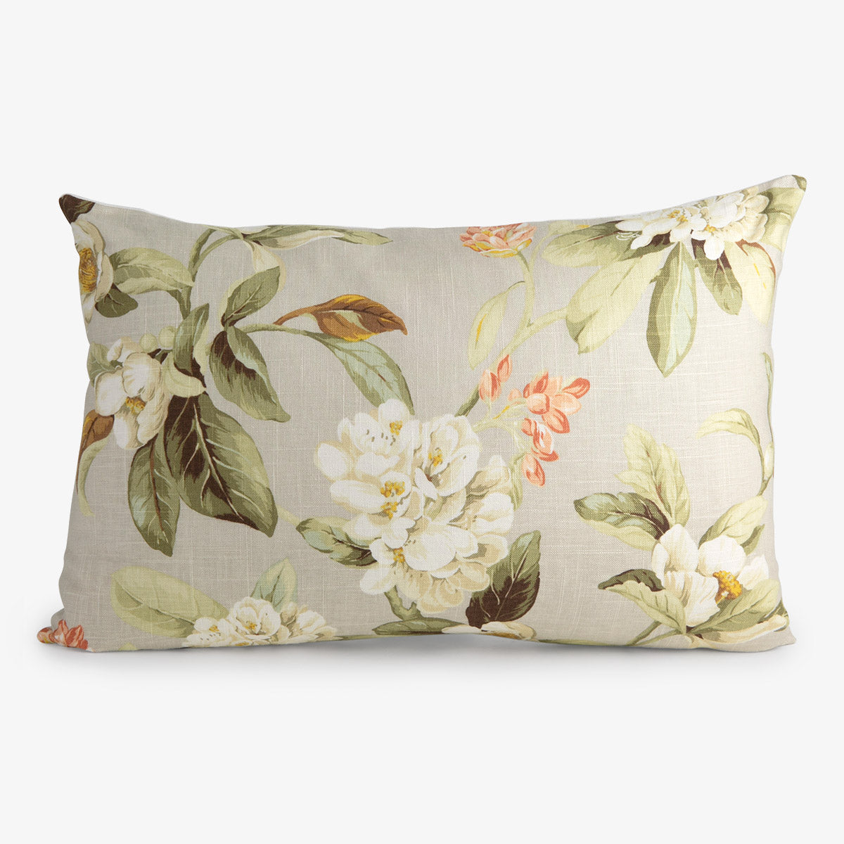 This elegant cushion features stunning magnolias and rhododendron in exquisite shades of soft white and peach set upon a beautiful earthy background.