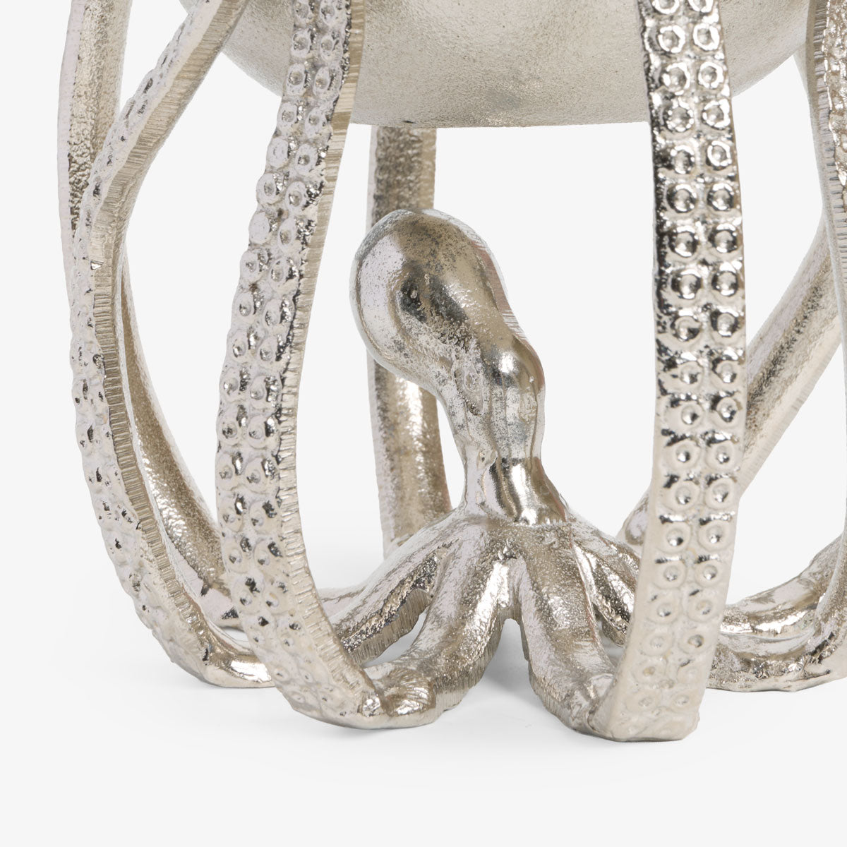 Crafted from aluminium with a nickel-plated finish, this statement piece features a detailed octopus form, with textured tentacles rising to support a bowl. The reflective surface catches the light beautifully, bringing a polished accent to both classic and contemporary interiors.