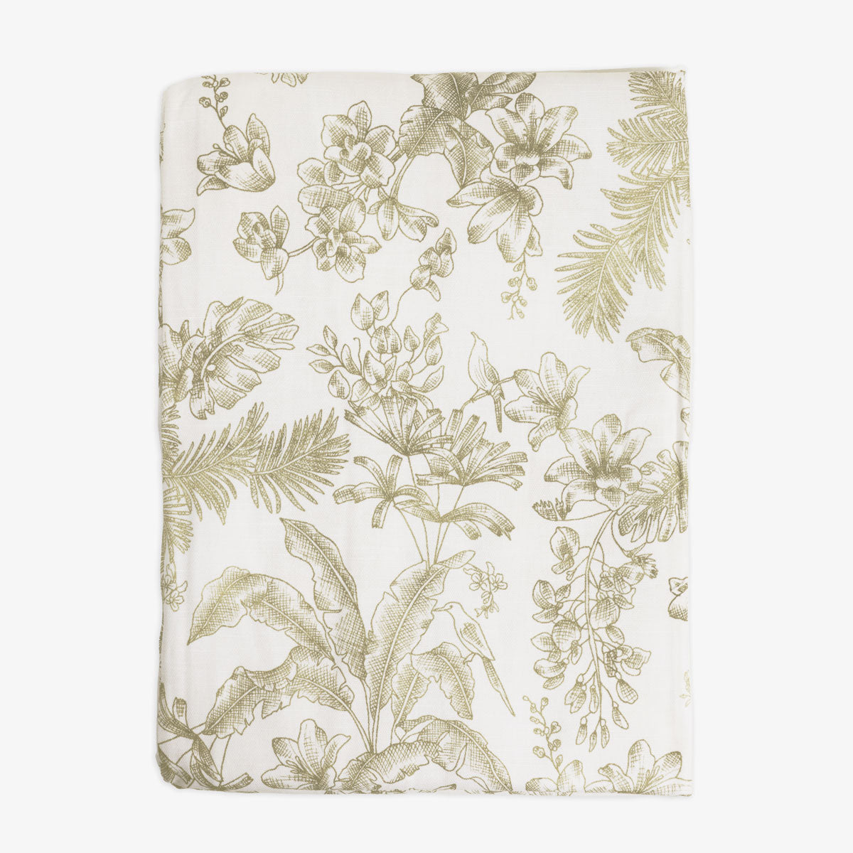 Crafted from 100% cotton, it features an intricate palm and floral illustration in soft, natural tones that add subtle pattern without overwhelming the table.