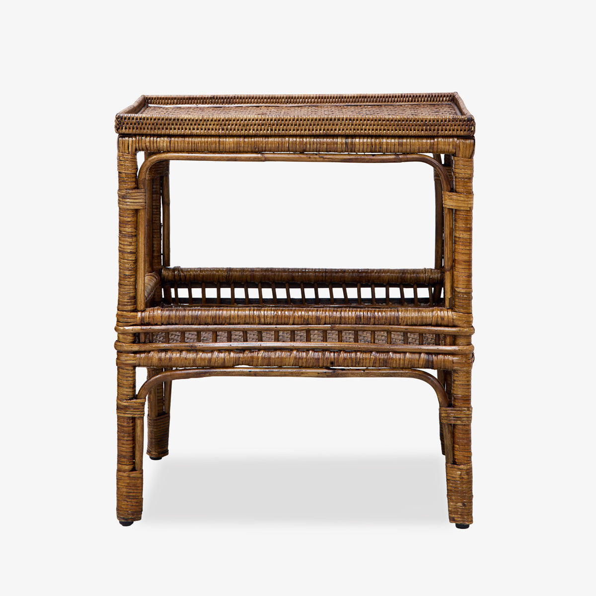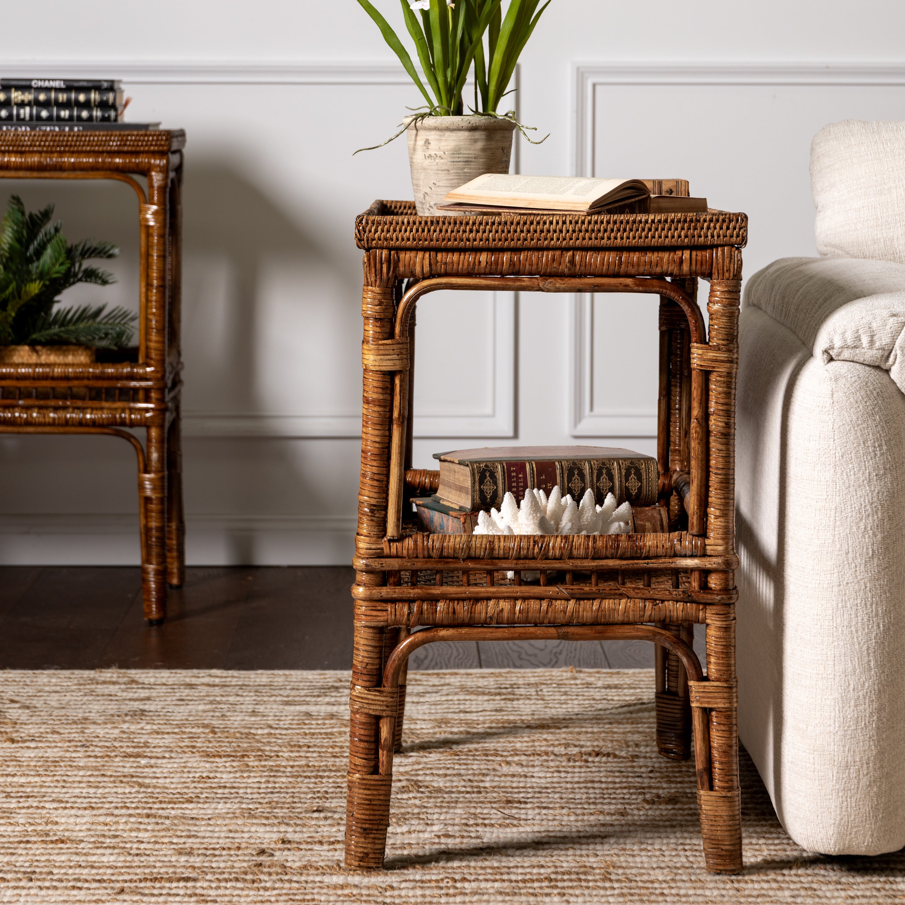 Handcrafted from natural rattan, this piece showcases artisanal craftsmanship and a lightweight, airy silhouette that suits both coastal and classic interiors. The raised top and lower shelf offer functional storage or display space, while the warm, woven finish adds an organic touch to any room. Whether placed beside a bed, lounge chair, or sofa, it brings effortless charm and versatility to your space.