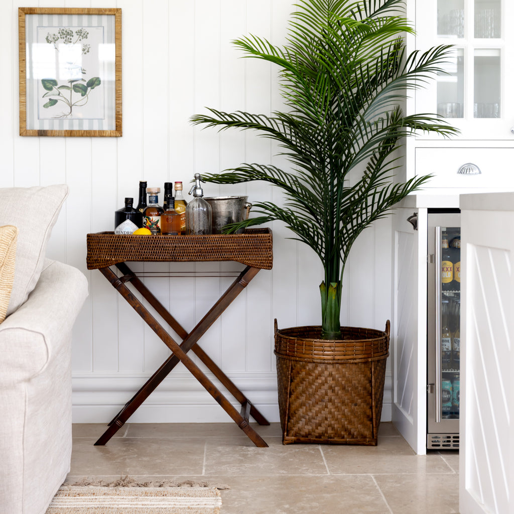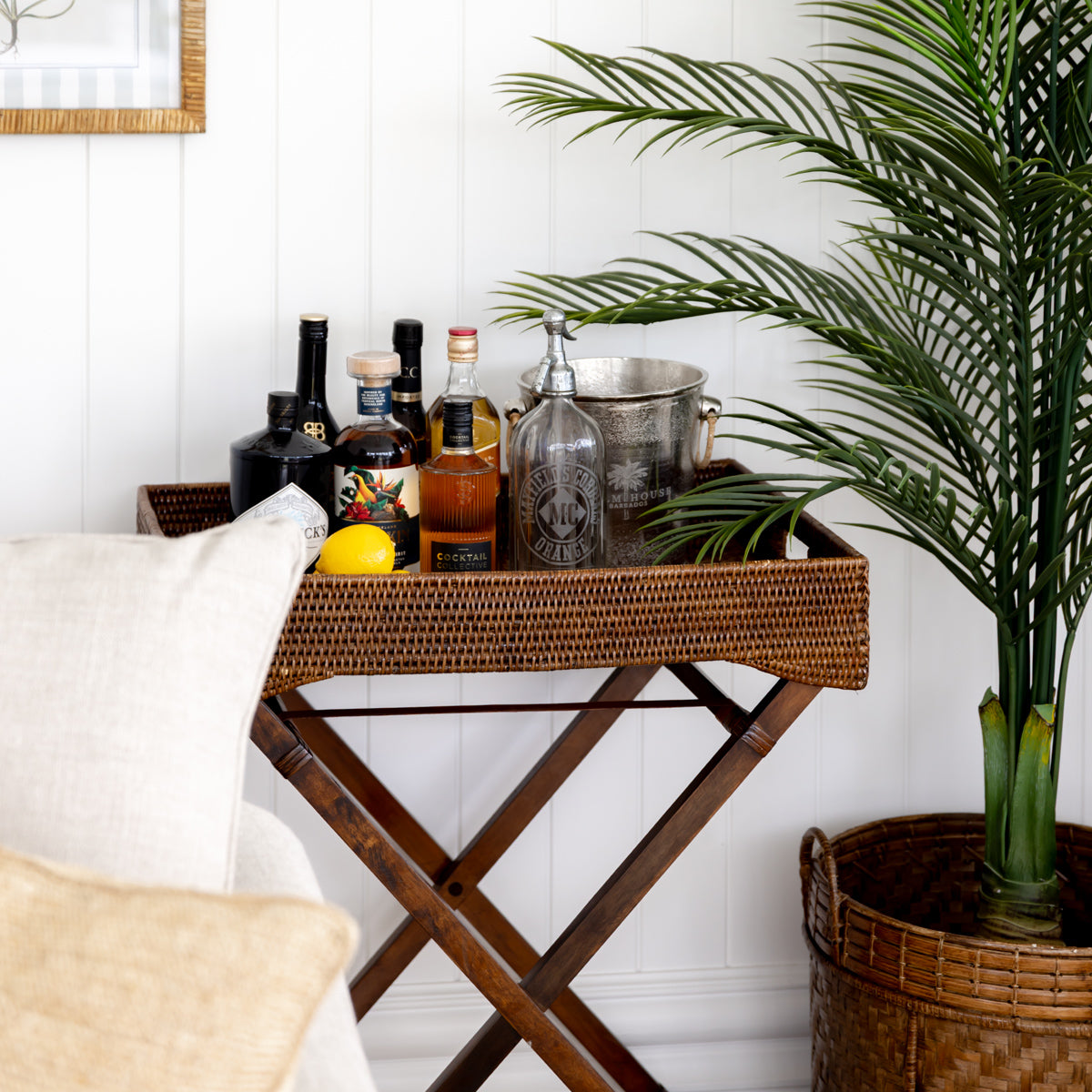 This classic rattan tray sits on a timber base with leather strapping. Use in an entrance way to store keys and miscellaneous items, as a side table in the lounge room or maybe even as a bar cart at parties.