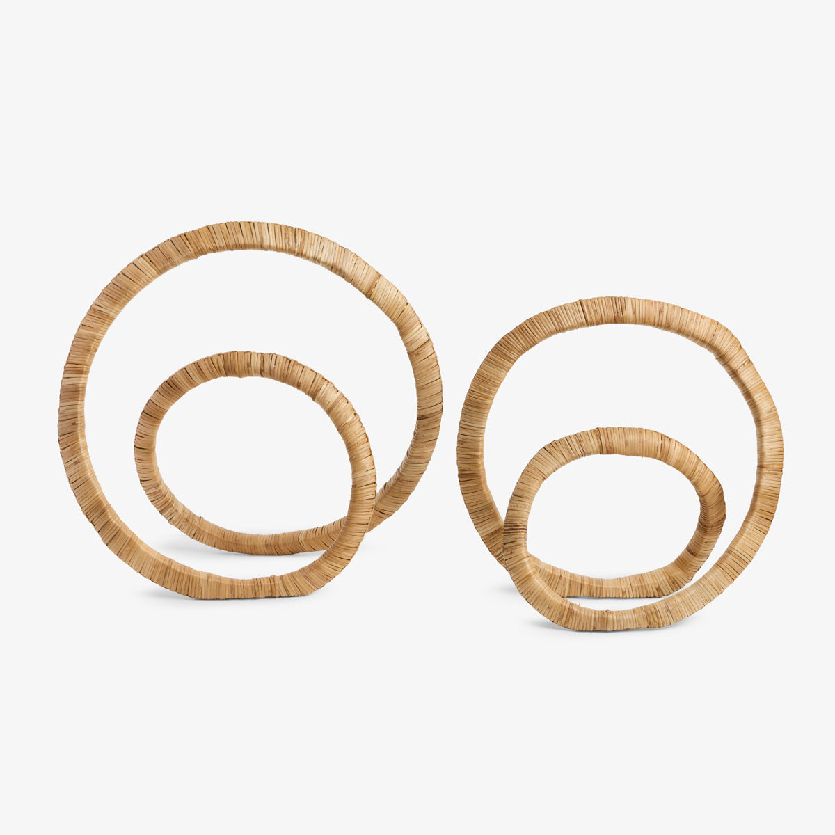 Crafted from aluminium and wrapped in rattan, each sculpture features an elegant circular form that brings a sense of movement and warmth to your decor.