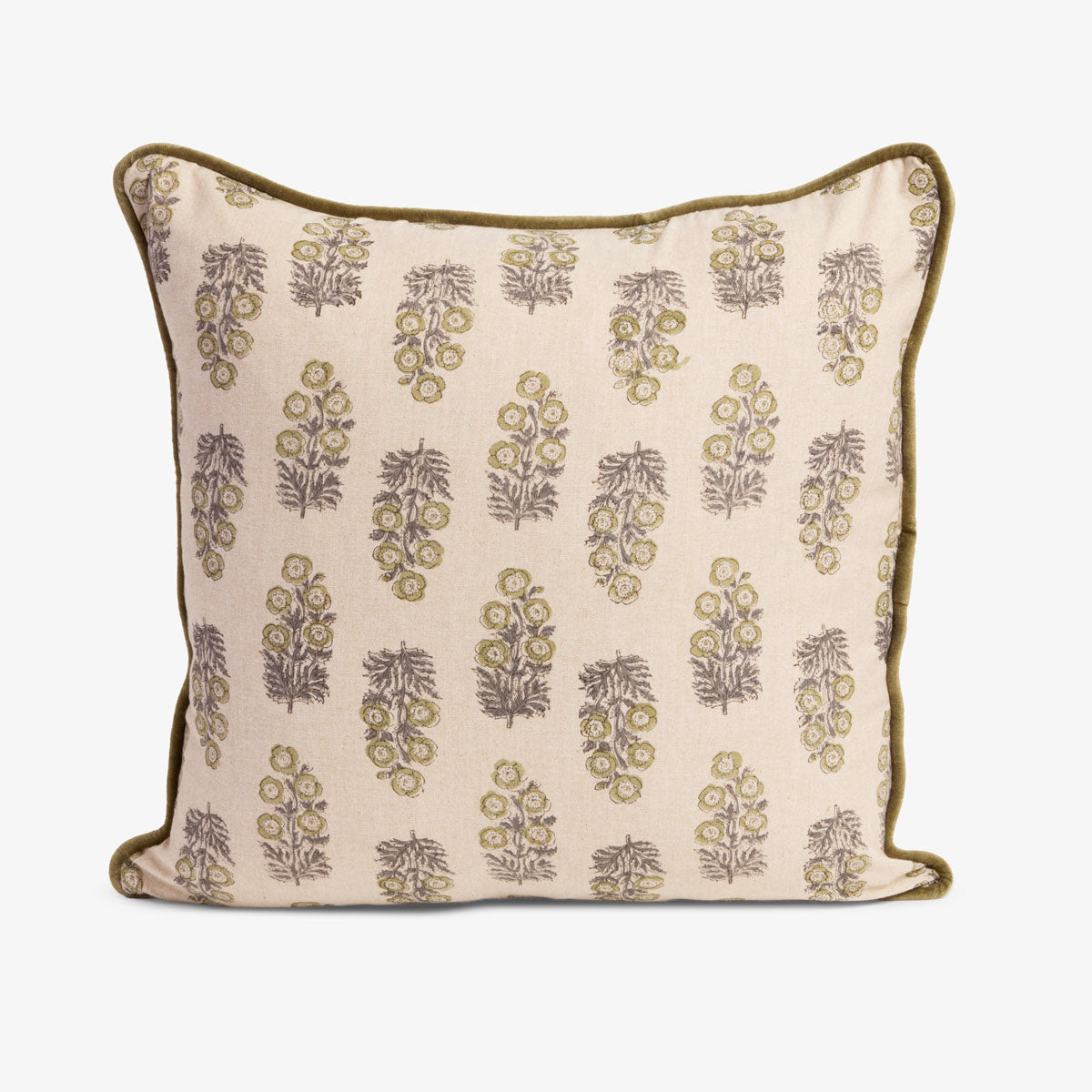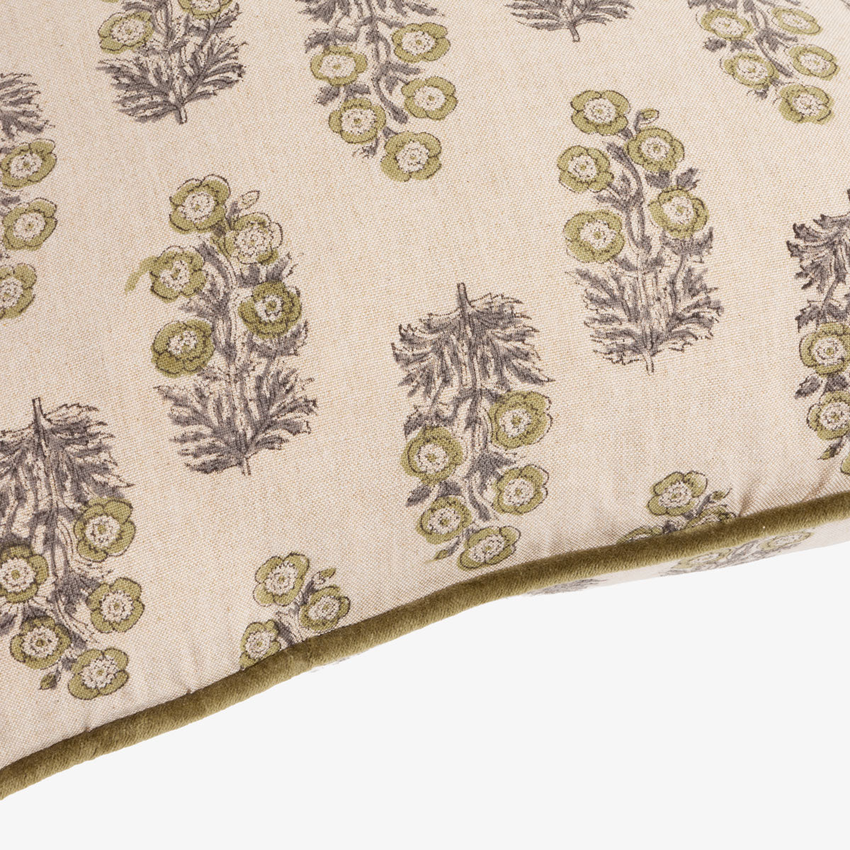 Crafted from cotton and finished with plush velvet piping, this design features a delicate block-print motif in muted sage and beige tones. The repeating floral-inspired pattern adds subtle visual interest while maintaining a calm, sophisticated aesthetic.