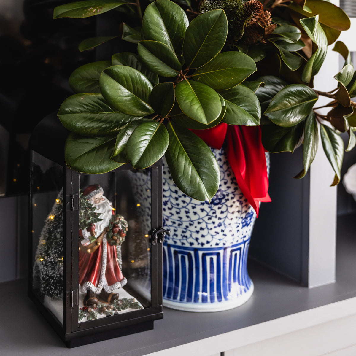 Inside the lantern, Santa Claus carries a tree and wreath as he stands in front of another Christmas tree. The tree is dusted with white snow, while at Santa's feet, lies a lush green garland, embellished with pine cones.