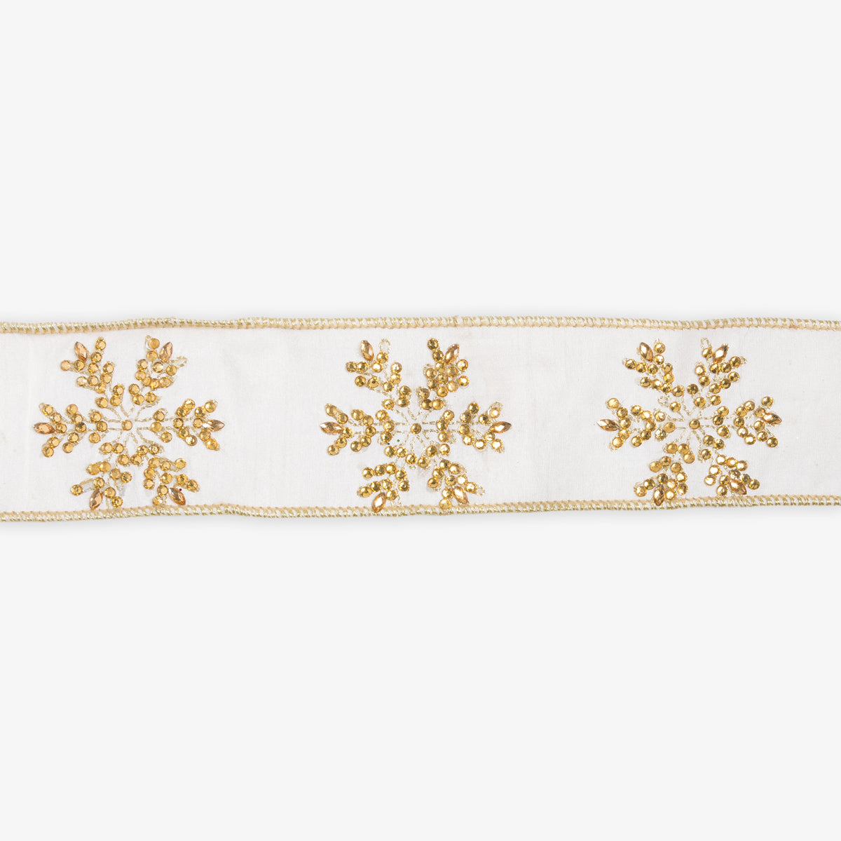 Glistening gold diamontes form snowflake designs on this silk dupion ribbon with a sheer back and gold edge.