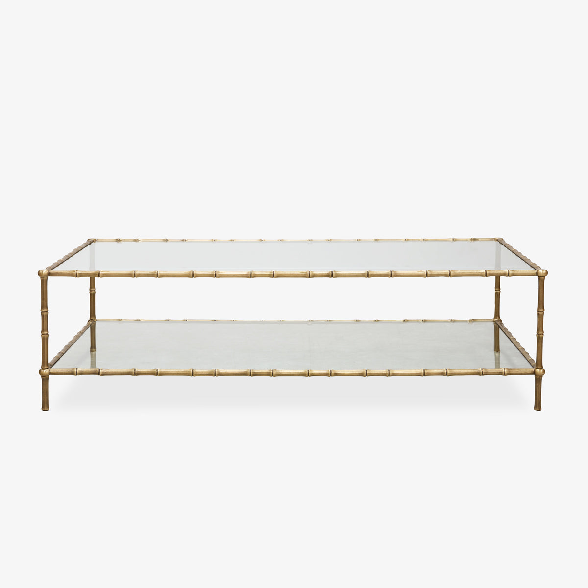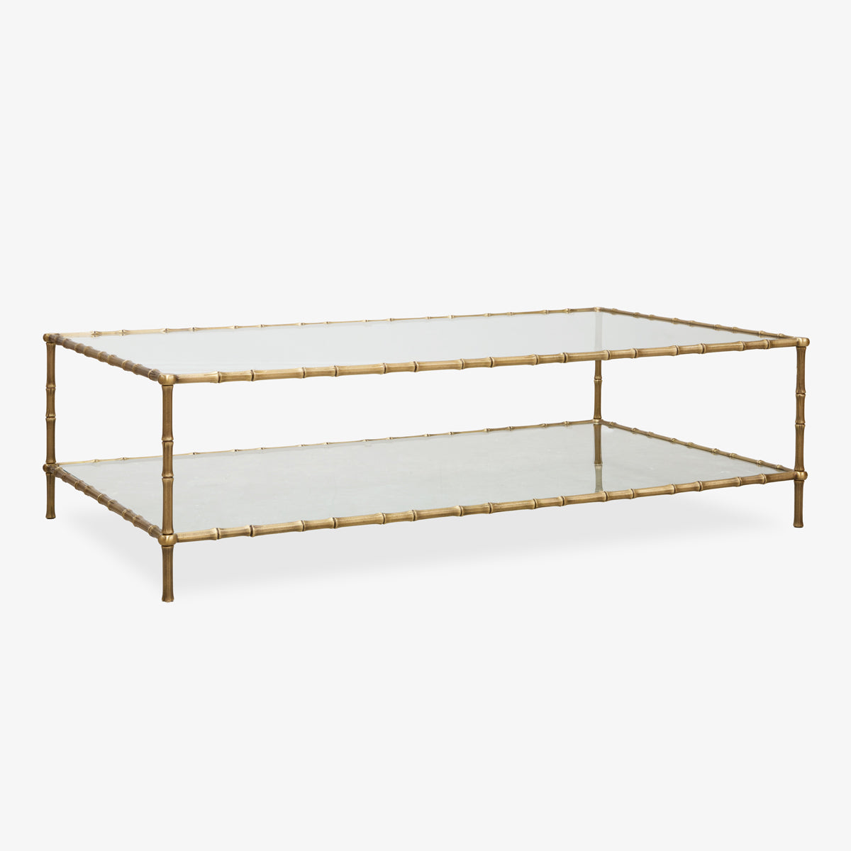 Crafted with an antique brass frame featuring bamboo-style detailing, this elegant design balances tropical inspiration with timeless sophistication. The clear glass top and lower shelf provide an airy sense of space, ideal for displaying coffee table books, floral arrangements, or decorative accents.