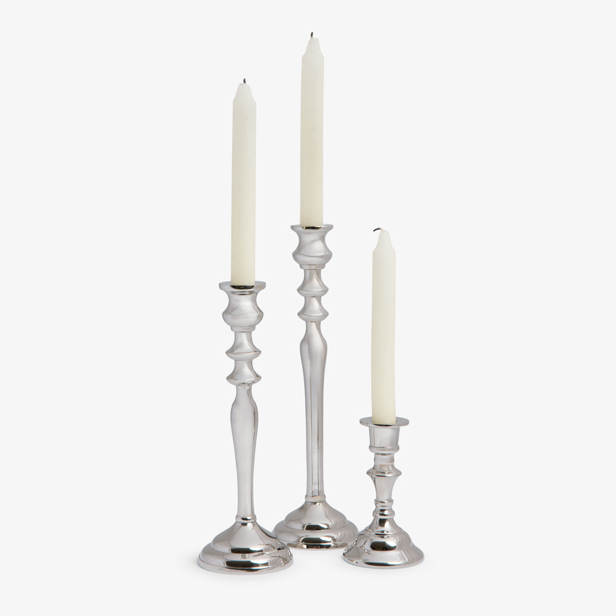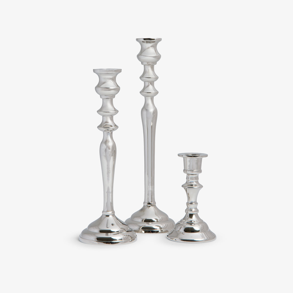 Made from nickel-plated aluminium, each piece features a sculpted silhouette with a polished silver hue finish. Available in three sizes, they’re designed to hold standard taper candles (2cm wide) and can be styled individually or as a clustered trio. Perfect for dinner parties, weddings, or holiday gatherings, these metal candle holders elevate any setting with their quiet elegance.