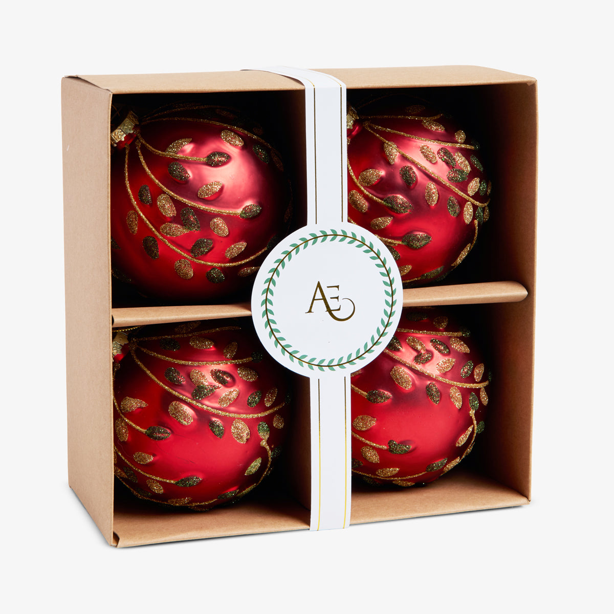 Celebrate the season with this set of 4 red trailing leaf Christmas baubles.