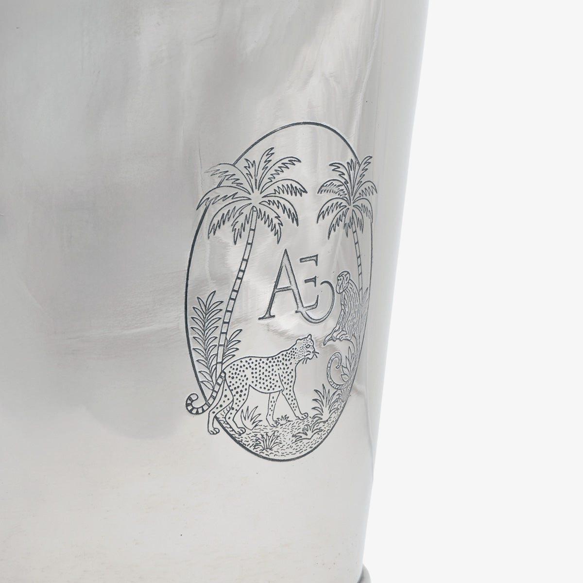 Made from aluminium with a polished nickel finish, this wine bucket combines refined shine with a tropical motif featuring palm trees, leopard and monkey.