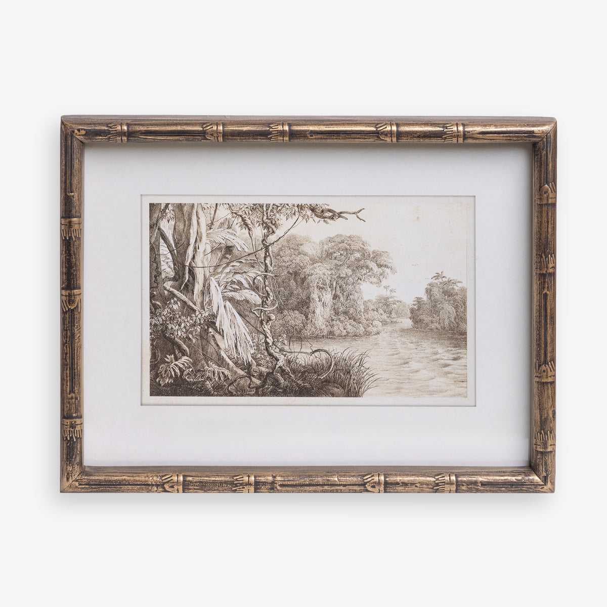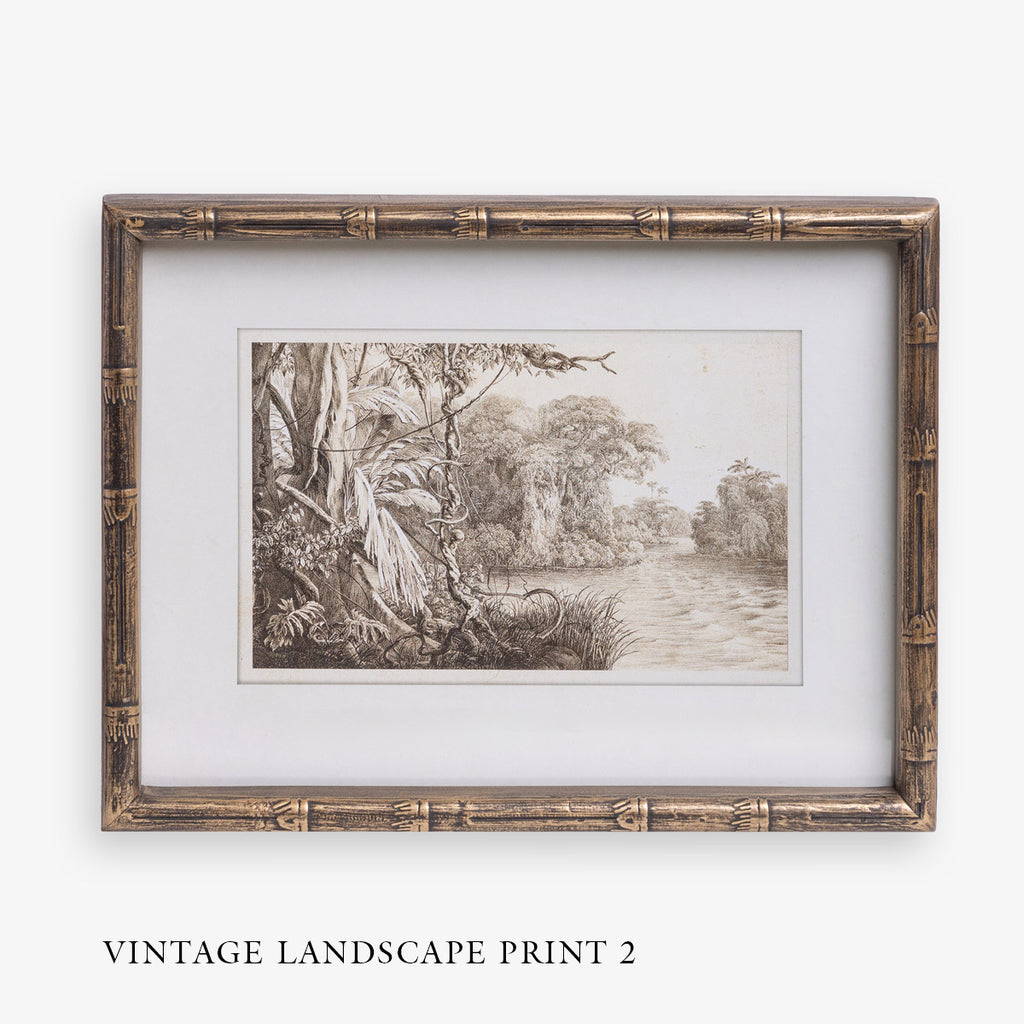 Enrich your interior with Vintage Landscape Print 2, a sepia-toned etching that captures a lush riverside scene with rich botanical detail.