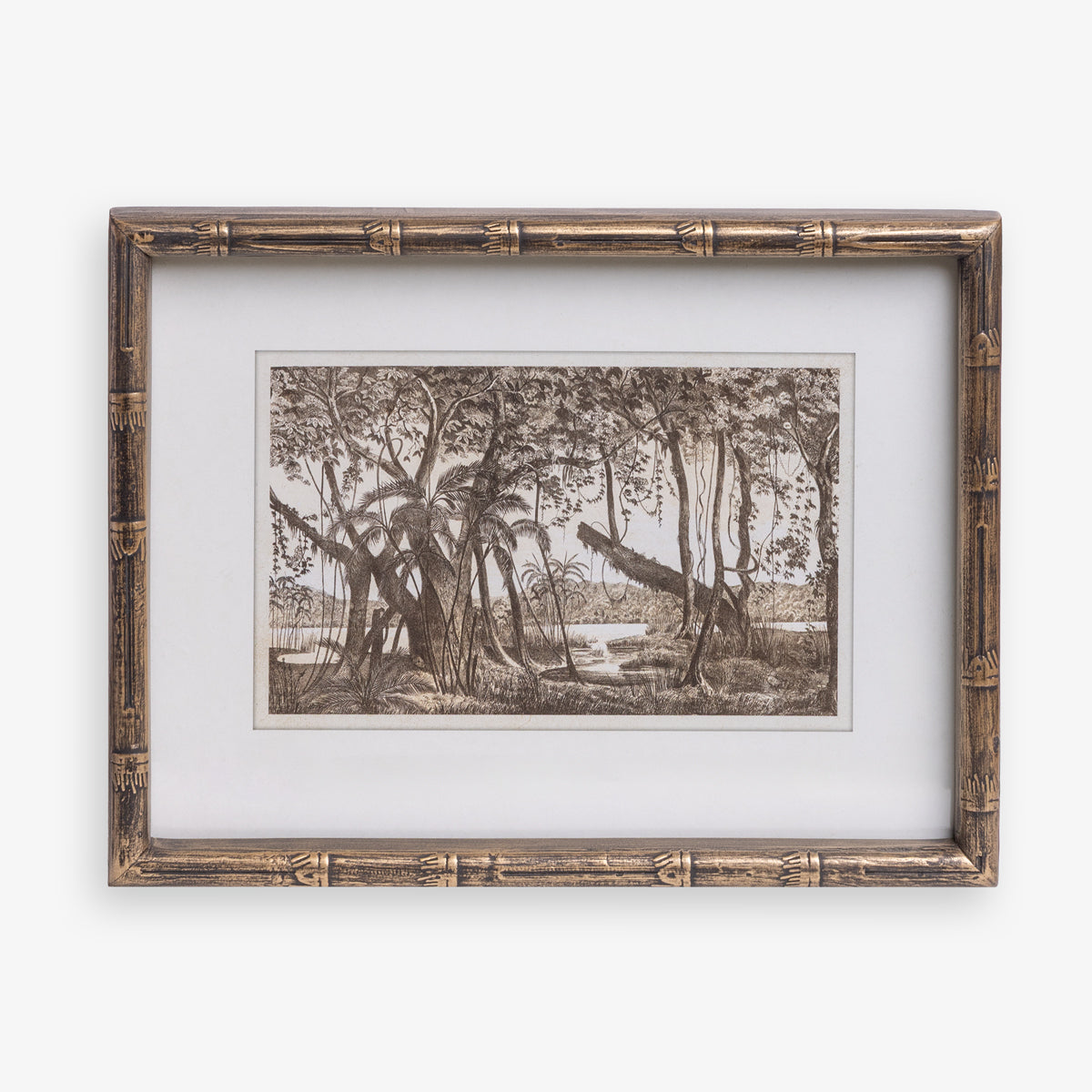 Complete your gallery wall with Vintage Landscape Print 3, a finely detailed sepia-toned etching depicting a forested tropical scene.