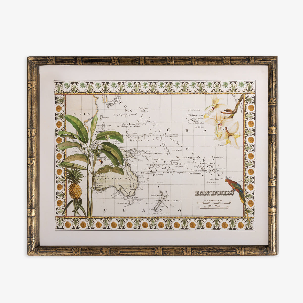 Surrounded by botanical illustrations and tropical motifs—pineapple, banana leaves, orchid and bird—it’s framed in a bamboo-style frame with a white printed border for an elegant finish. A striking piece for studies, hallways, or libraries, this vintage map print offers a refined blend of geography and artistry.