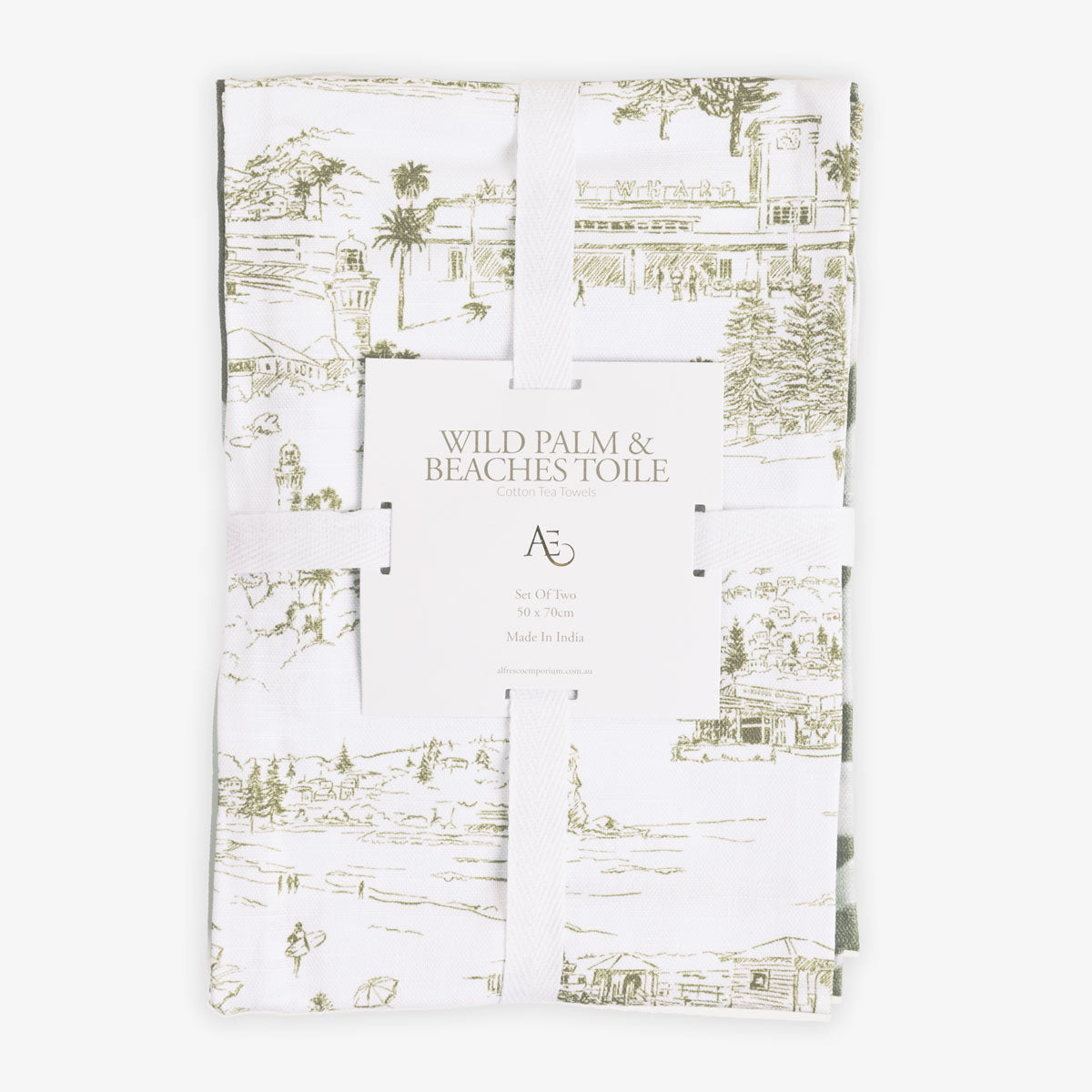 Elevate your kitchen styling with the Wild Palm & Beaches Green Toile Tea Towels (Set of 2), crafted from soft, absorbent cotton.